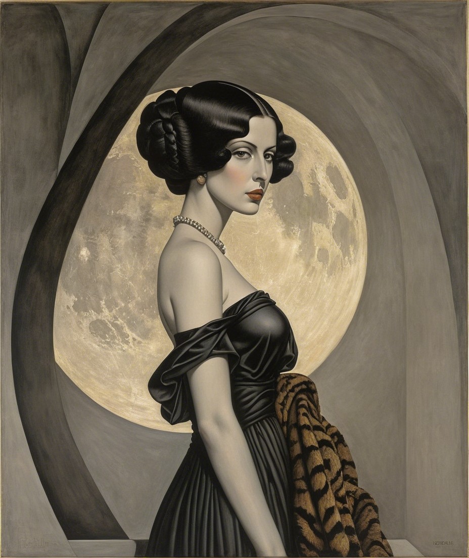 A glamorous woman with elegant black hair styled in vintage curls stands against a large, glowing moon. She wears a sophisticated black dress accented with pearls and holds a coiled rope.