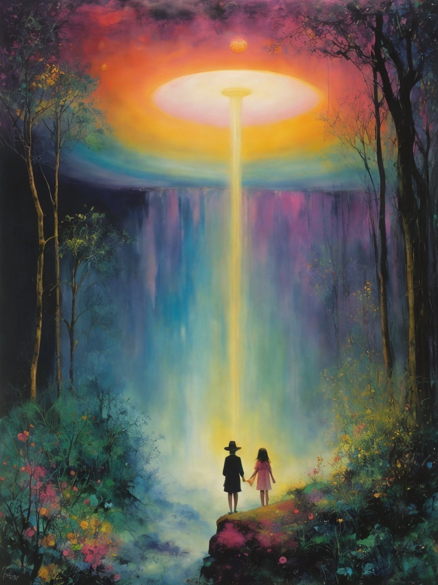 Two children stand hand-in-hand in a mystical forest, gazing up at a colorful UFO hovering above, radiating a bright beam of light that illuminates the enchanting scene around them.