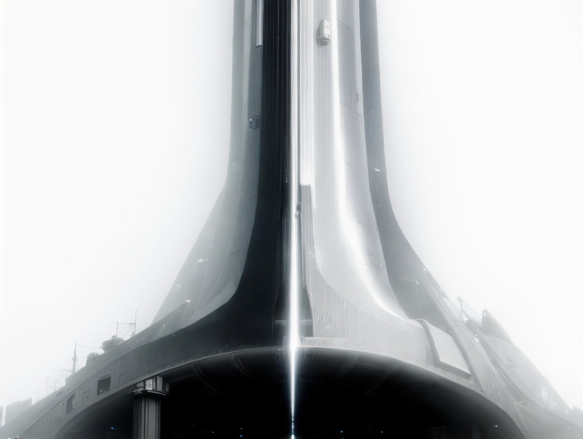 A futuristic skyscraper looms in mist, its sleek architecture vanishing into the white foggy abyss above.