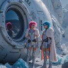 Majestic architecture rises from a snowy landscape, bathed in warm light. A giant planet looms in the sky, while figures stand in the foreground, adding a sense of scale to the ethereal scene.
