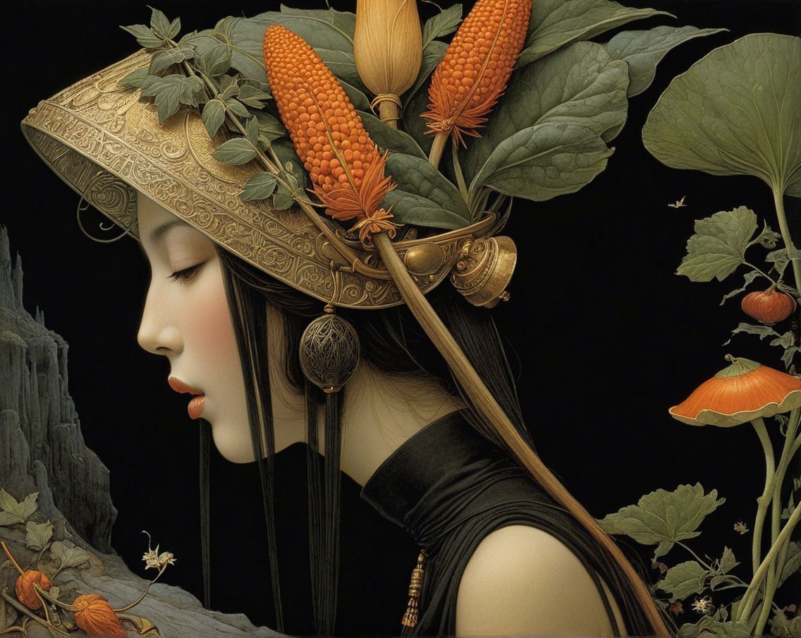A serene profile of a young woman adorned with a golden turban and vibrant tomatoes. Her long, flowing hair and intricate earrings enhance the lush, artistic elements surrounding her.