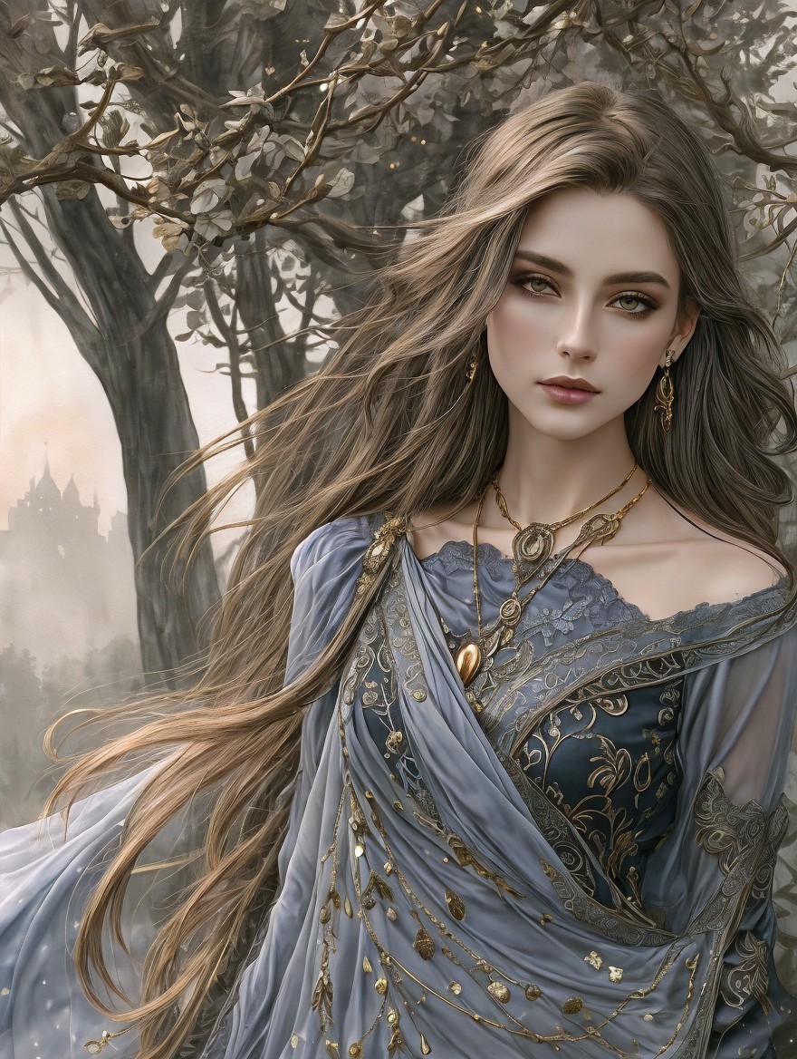 A woman in a flowing blue gown stands under a tree, gazing at a full moon in a twilight sky.