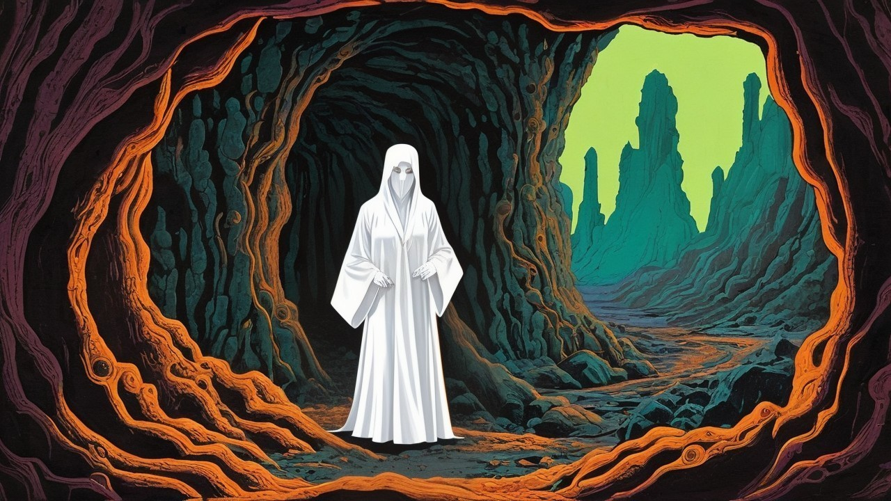 Prompt: "An orange man makes fecal cave paintings, looking out upon a ruined world.