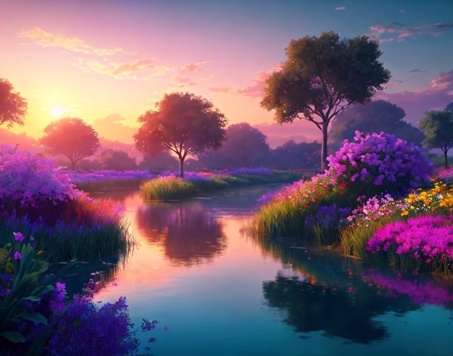 A serene sunset with vibrant purple and pink flowers beside a calm river, reflecting the warm sky hues, surrounded by lush trees.