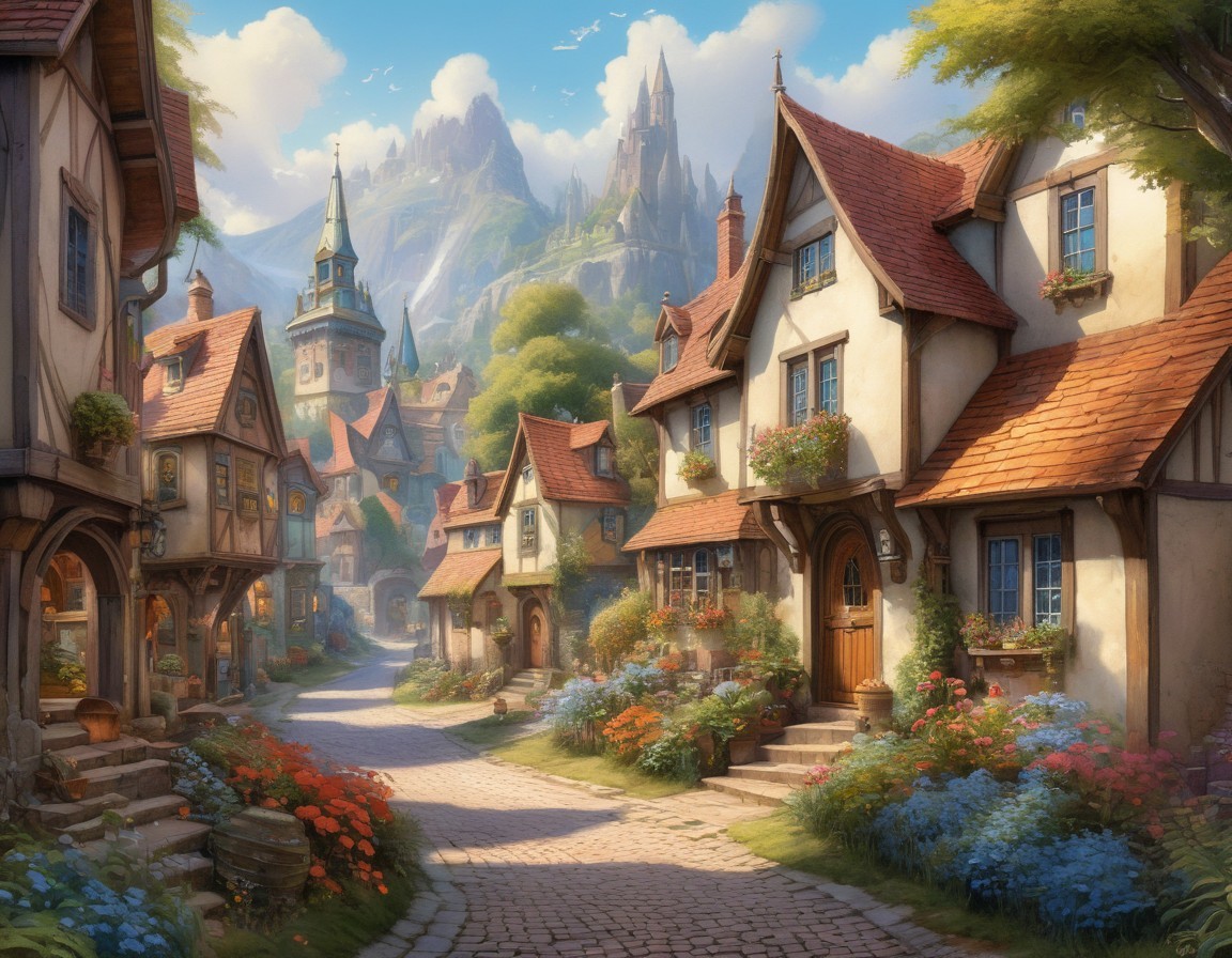 A quaint village street at sunset with charming houses, blooming flowers, and a warm, inviting atmosphere.