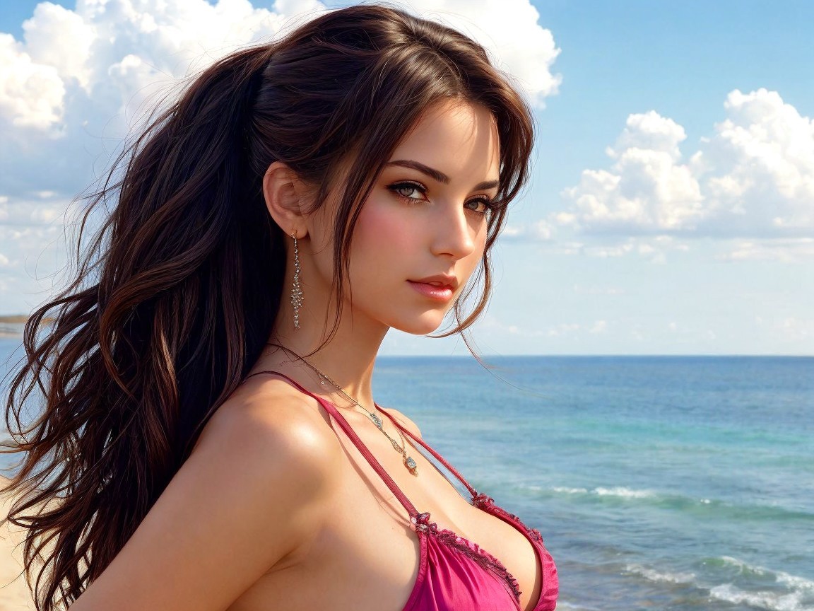 A young woman with long, flowing hair stands by the beach, gazing thoughtfully into the distance. She wears a pink outfit adorned with jewelry, with a vibrant blue ocean and fluffy clouds behind her.