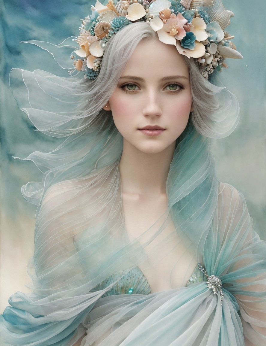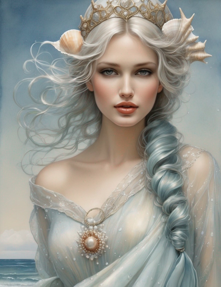 A woman in a wide-brimmed hat and pearl jewelry, with the ocean in the background, exudes classic elegance.