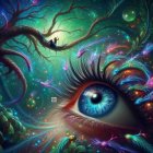 A vibrant, surreal close-up of an eye, featuring a striking blend of blue, green, and gold hues. The eye is surrounded by colorful, glossy droplets and swirling patterns that enhance its allure.