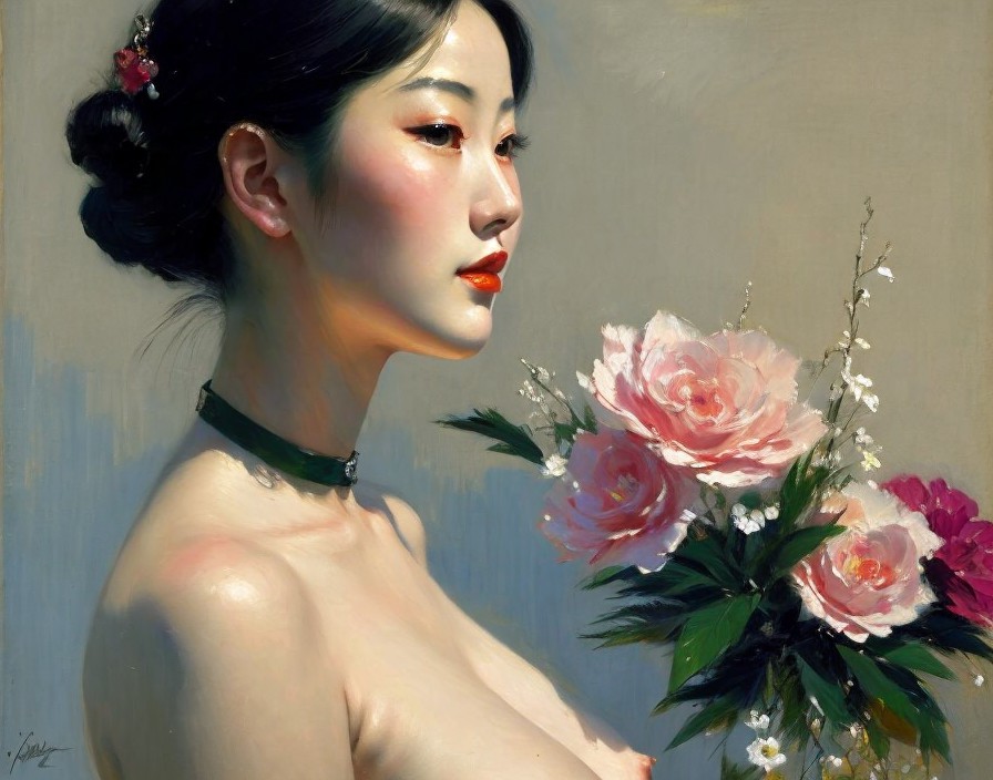 A painting of an elegant woman with a flower in her hair beside a bouquet, characterized by soft brushstrokes and warm tones.