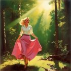 Prompt: Gil Elvgren Painting, mature Swedish fashion model age 45 in vibrant forest scene, mature Carmen Dell'Orifice/Julie Harris/J.K. Rowling face, slender build and long, flowing blonde hair, expensive open-color white button-down blouse, a pink full skirt,black heels. A brown belt cinches her waist. walking forward, holding the skirt open, and gazing slightly to the side with a calm expression. forest setting is lush and green, with tall trees and dappled sunlight filtering through the canopy. The light is bright and golden, creating a warm, inviting atmosphere.