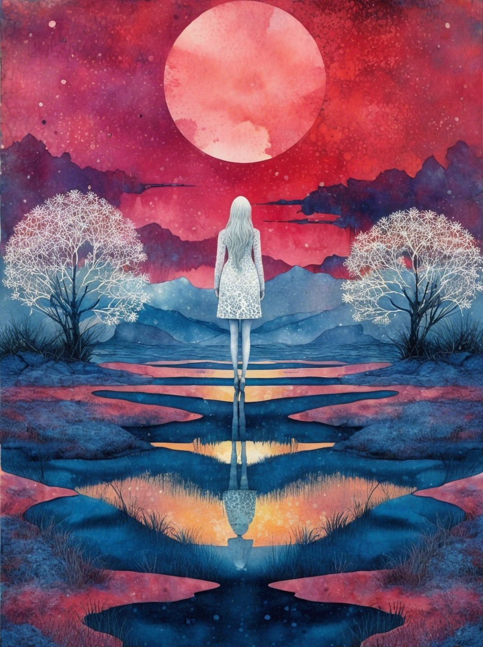 A serene landscape features a glowing red sun above a tranquil lake, surrounded by frosty white trees. The vibrant sky reflects on the water, merging warm and cool tones beautifully.