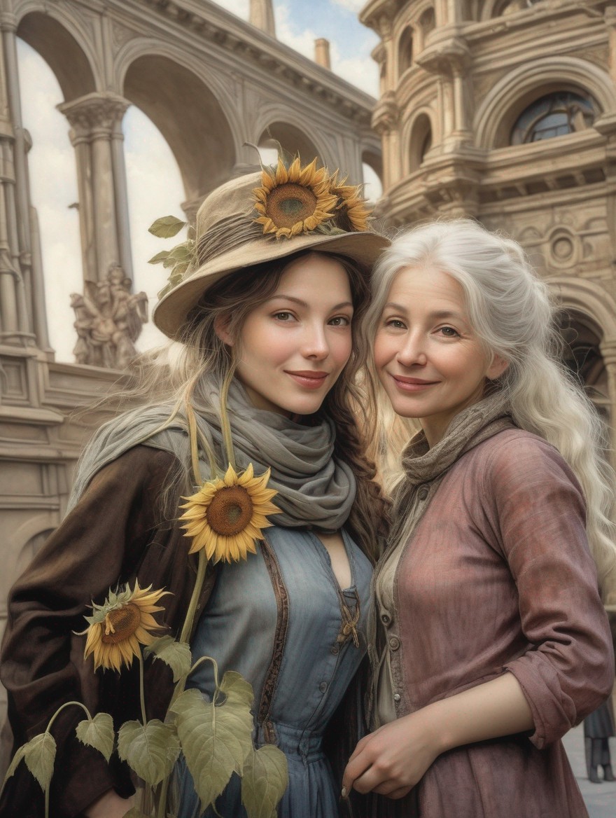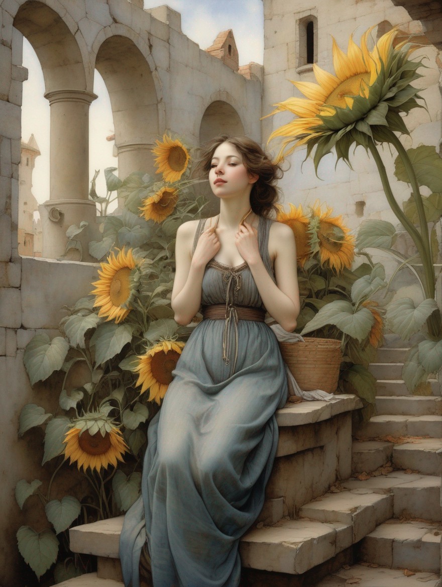 A painting of a woman in vintage clothing with a serene landscape behind her, featuring flora and subtle hills.