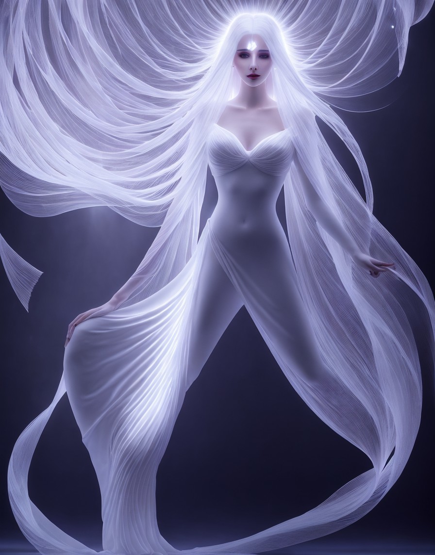 Ethereal figure clad in white with flowing hair and gown, surrounded by swirling mist and luminescent elements against a dark backdrop.