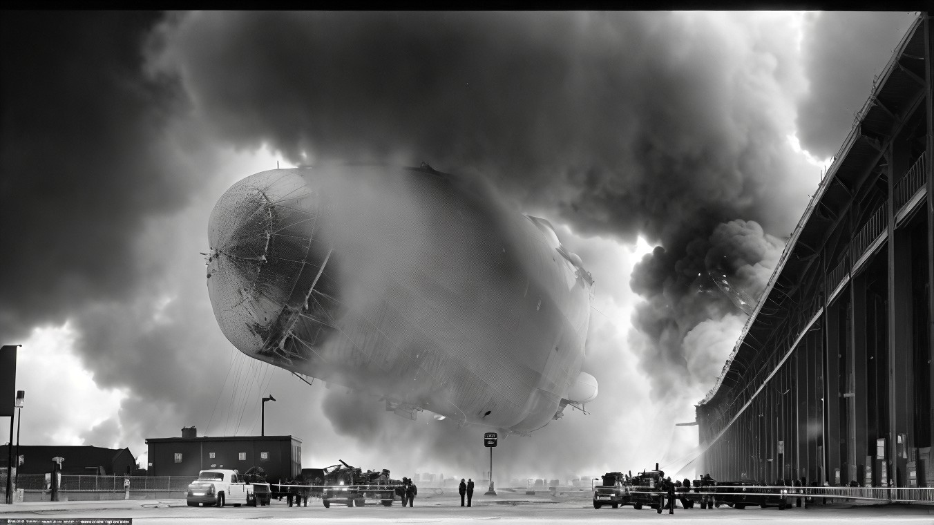 A massive airship looms in the sky, engulfed in thick black smoke. Below, debris and figures are silhouetted, conveying a dramatic sense of disaster and chaos in a monochrome setting.