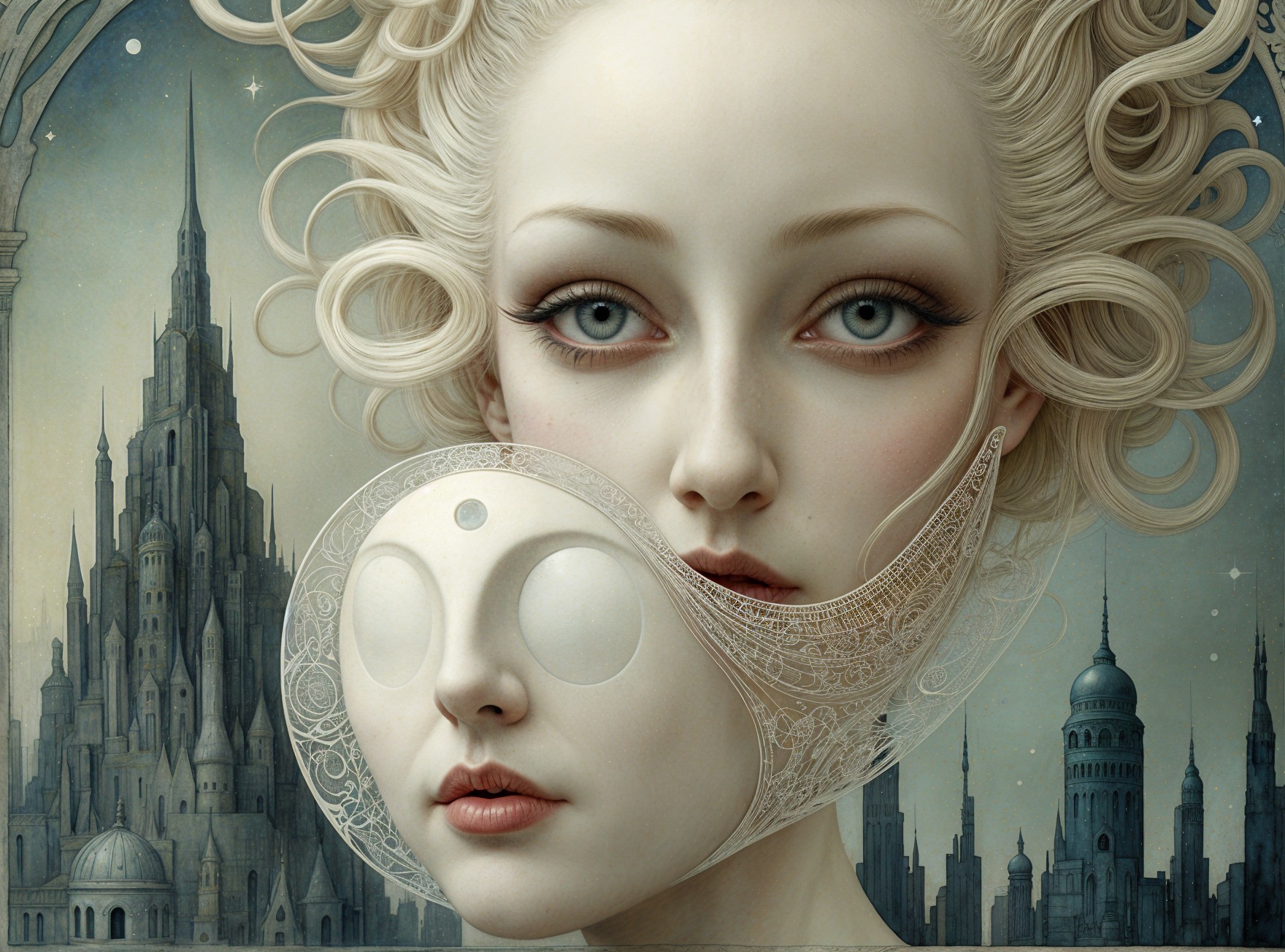 A surreal artwork featuring a woman with ethereal beauty and intricate features, alongside a smaller, serene face. A mysterious, moonlit cityscape forms the backdrop, enhancing the dreamlike atmosphere. Original Prompt: Molly Johnston