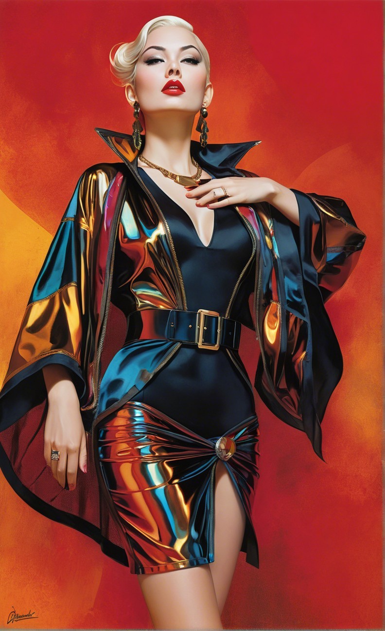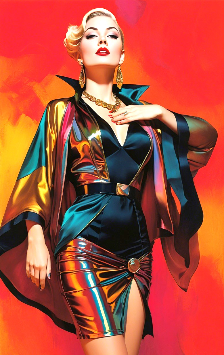 A glamorous woman in a form-fitting, iridescent dress exudes confidence. Her vintage hairstyle and bold makeup complement a striking pose against a vibrant, colorful background.
