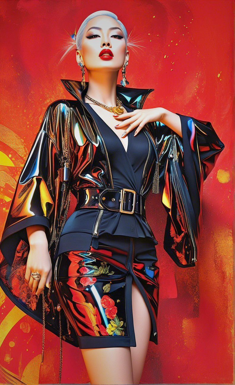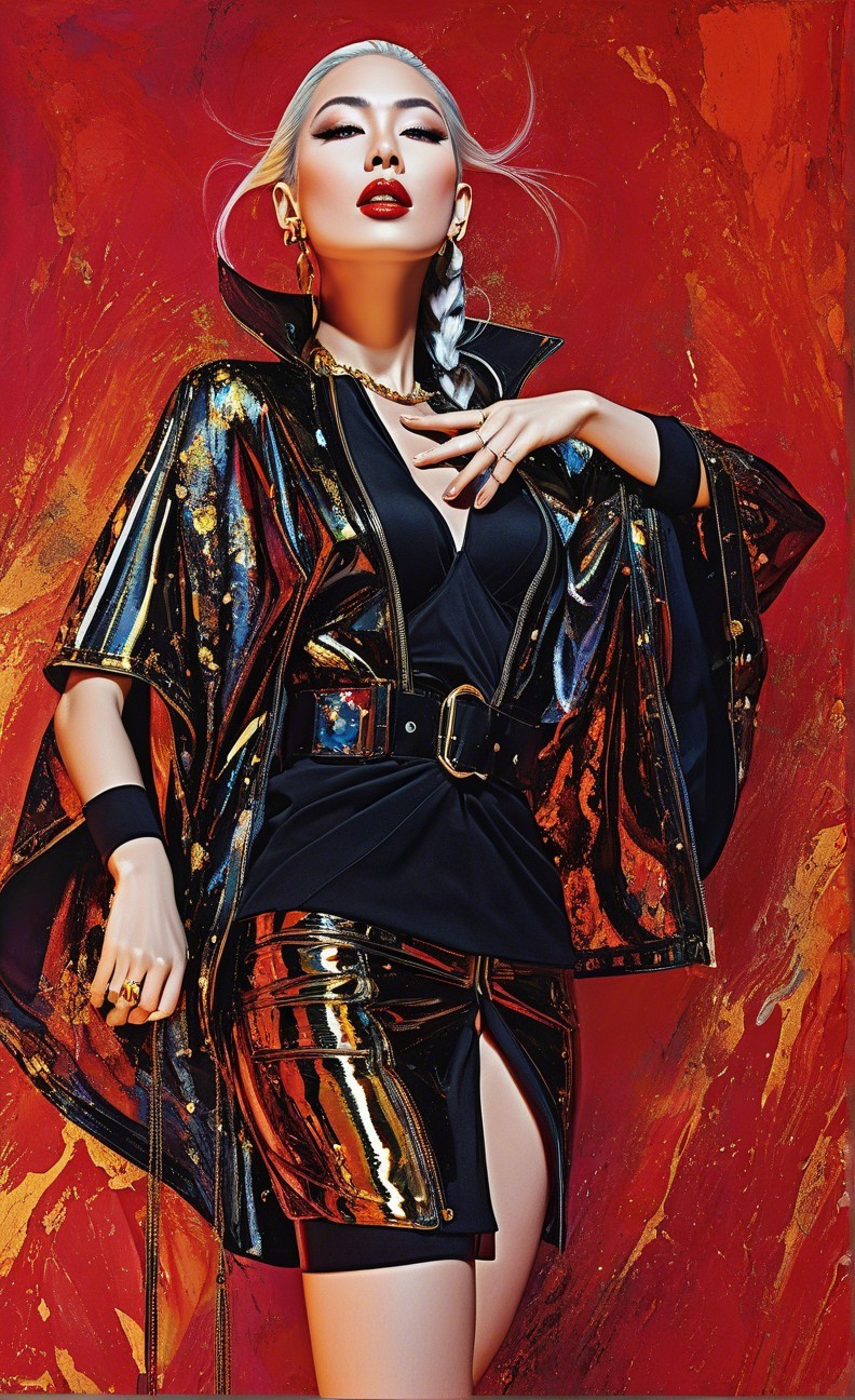 Prompt: "3/4 upper body Portrait Inspired by the style illustrations of Hajime Sorayama, Joan Miró, Hayao Miyazaki, Josephine Wall, Katsuhiro Otomo, Renny Tait, Storm Thorgerson, Man ray, Jean Paul Gaultier, Ho baron. bright saturated color image, golden, wide slivered outlines, marbled, tesselated, bright morning lighting, strong curls, aquatrelle extrusion, auburn-red, pale silver, burnt sienna, metallic-honey, crisp clean edges, flowing hints of colors, ultra defined details, ink painting rendered in plique-à-jour details, long-exposure dof, layered, great depth and scale, Intricate silk canvas, abstract postexpressionism, dreamy dystopian portraiture, stylized illustration, colourful surreal lineage forms, smoothly related contouring outlines, asymmetric composition, mixed 2D and 3D construction, fragmented, partially transparent, (textured background, filigree, fishnet details, stylized brushstroke details, anisotropic filtering, hallucinations, flecks, grain, spots, 3 point lighting, ultra 3-dimensional effect, Reverse pathogen light, tints by Ho Baron, hallucinogenic, supergrunge, acidic neonoir, convoluted, bubblegumstyle, gradient inking colors visible texture, warm coloring, clear, ultra-real, soft glow, trippy, radiance,,dyed, estranged metallic paints for a dappled glow, Whimsical retro fusion, Riemann's geometrical spheres, vibrant greens and light-reds with complementary colors, digital art with metallic-honey coloring, luminous,"