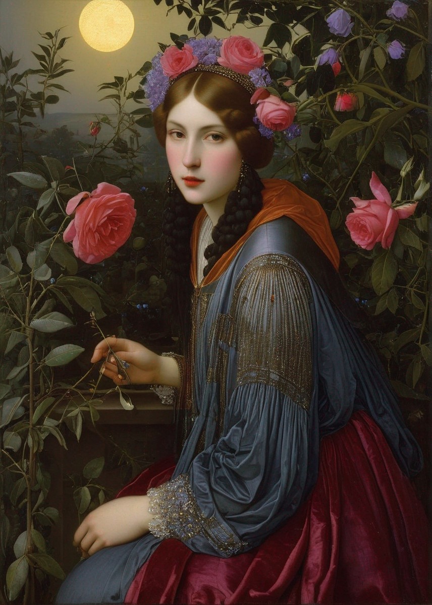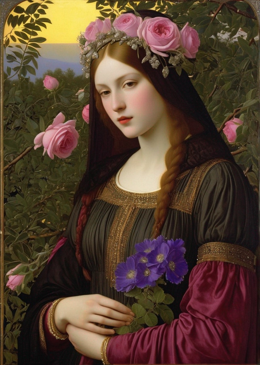 A painting of a woman with fair skin and a serene expression, wearing a purple dress, with gold jewellery, against a rosebush background and a yellow halo.