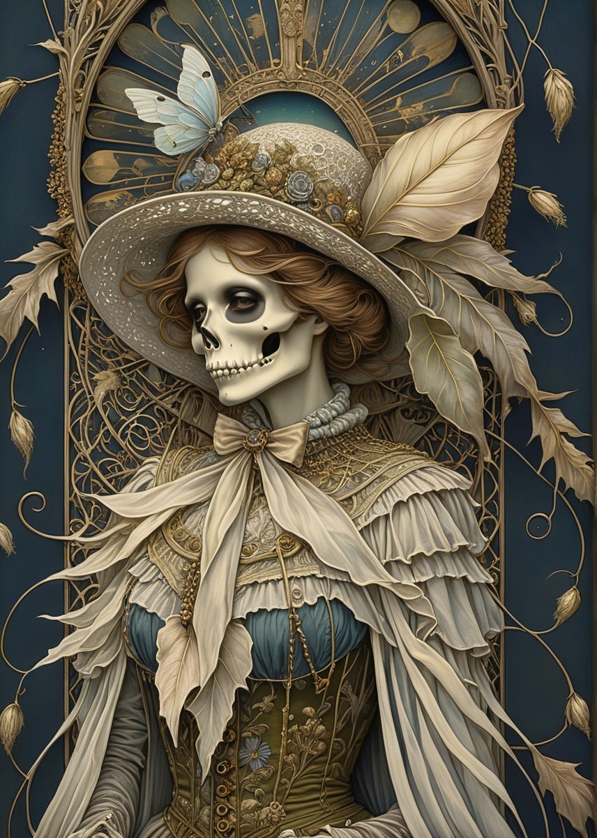 A beautifully detailed skeleton adorned with lush foliage and flowers wears a large, elegant hat. Set against an ornate backdrop, it blends elements of nature and the macabre.