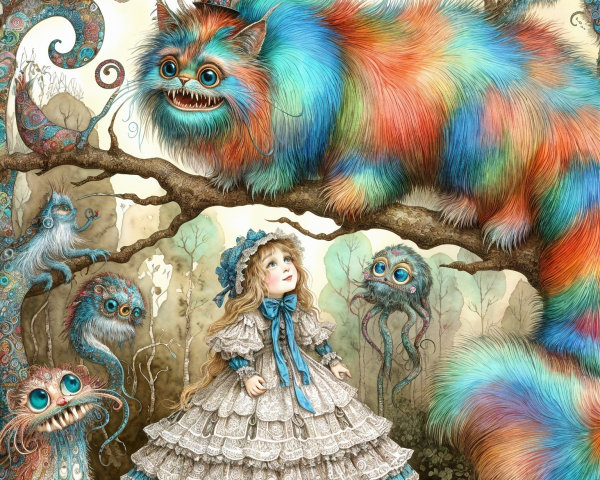 A surreal artwork of a female figure with an ornate, mechanical headpiece above a small figure with a scepter in a clockwork carriage.