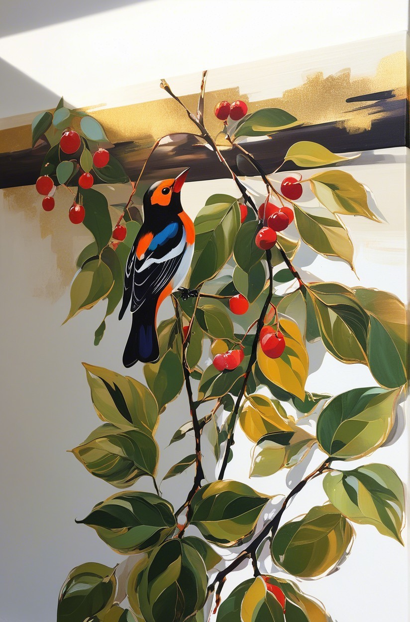 A vibrant artwork featuring a colorful bird perched among lush green leaves and bright red berries, blending nature with striking artistic elements and bold colors. Original Prompt from Deborah J Huber.