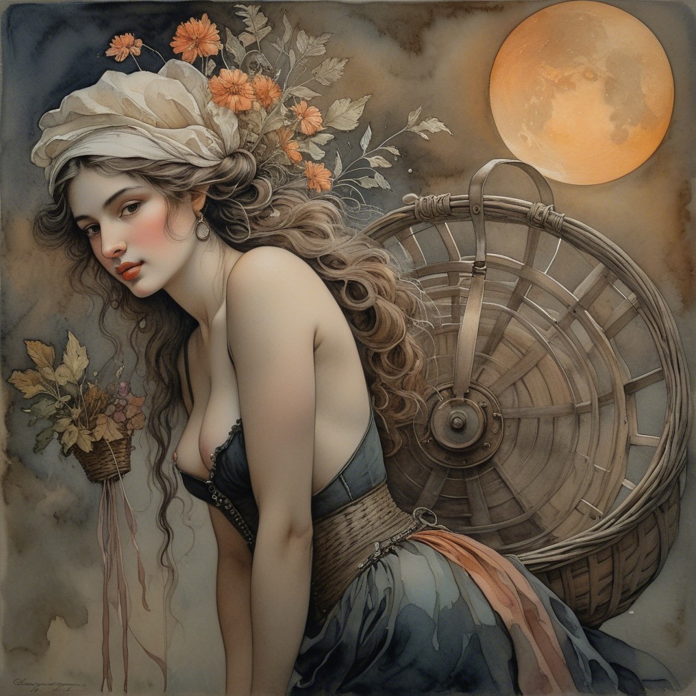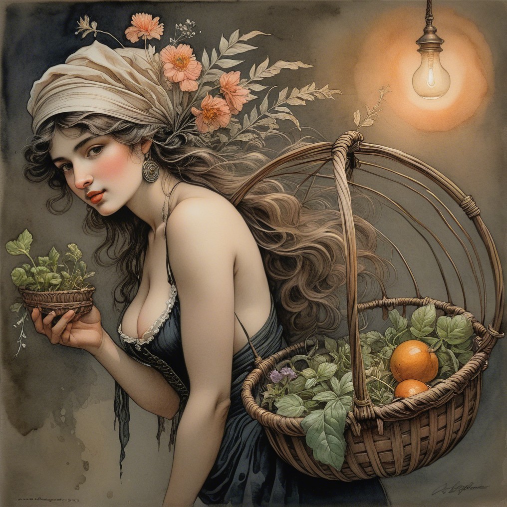 . Gypsy lady collecting herbs in basket , colored ink drawing, watercolor artwork on old withered paper, vintage, by Caravaggio, Fragonard, Anton Pieck, pale colors, high detail, intricately detailed, hyperdetailed volumetric lighting, art nouveau graphic steampunk ., whimsical, beautiful, poignant, touching. colors blush bronze, black. soft watercolor extra water in magical realism by Annigoni, Egon Schiele, Milo Manara, Botticelli, Catrin Welz-Stein, Jean Metzinger, Klimt, perfect eyes, perfect handsface, highly detailed, complementary colors, hyper detailed. Watercolor and ink splatter, dynamic pose, dark blue background, unreal engine, alphonse mucha, global illumination, detailed and intricate environment Beautiful woman in the style of Pino Daeni Dorota Piotrowiak Edward Gorey, junji ito, klimnt , gold leaf color, silver leaf color beautiful dynamic lighting high definition hdr * Random prompt award winning Max Ernst ultra detailed 4K 3D Texture