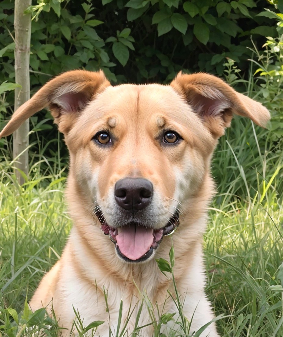 A golden dog with a happy expression sits amidst greenery and white flowers, gazing forward.