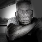A close-up portrait of a person resting their chin on their arm, featuring intense expression and deep wrinkles, set against a blurred background. The image is in black and white, highlighting their features.