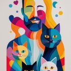 A vibrant, abstract artwork featuring four stylized figures with bold colors and geometric shapes. They have striking features and expressions, with one holding a black cat at the center.
