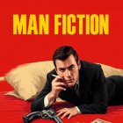 A stylish, animated character lounges on a bed, dressed in a black suit. He holds a cigarette, with a gun and magazines beside him, set against a bold red background. The title "MAN FICTION" is prominent. A take on the Pulp Fiction poster, but with a male version of Uma Thurman.
