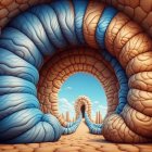 A surreal landscape features undulating, textured walls in shades of blue and tan, creating a fluid tunnel effect. A winding path leads toward a bright horizon dotted with whimsical formations.