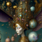 The image depicts a surreal, ethereal figure adorned with a golden crown and elaborate wings, surrounded by whimsical animals and colorful orbs, all set against a fantastical landscape.