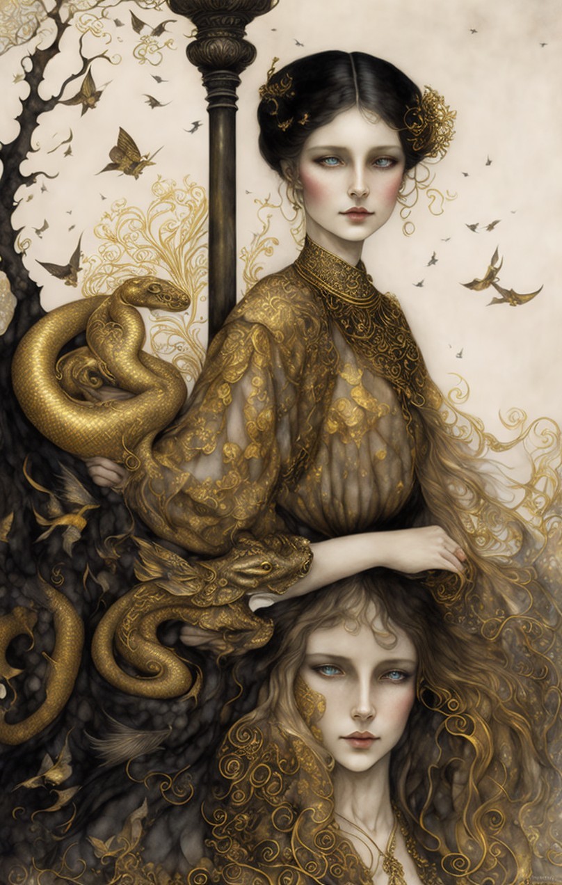 Legend of the Girl and the golden python. Velvet Black, Shabby, Dull Gold, Amber Gray, Golden Ratio, Surreal Fantasy, Elegant, High Definition Ultra Fine 3D Line, Zenangle Style, Watercolor Patchwork , Arthur Rackham Style, Paul Kidby, Gediminas Prankevicius, Jacek Jerka, Extremely Detailed, Intricate, Thoughtful, HDR, Fractal, Beautiful, Award Winning, Fantasy Look, Fantasy, Crisp Quality