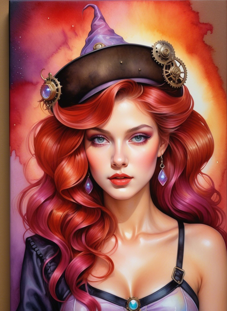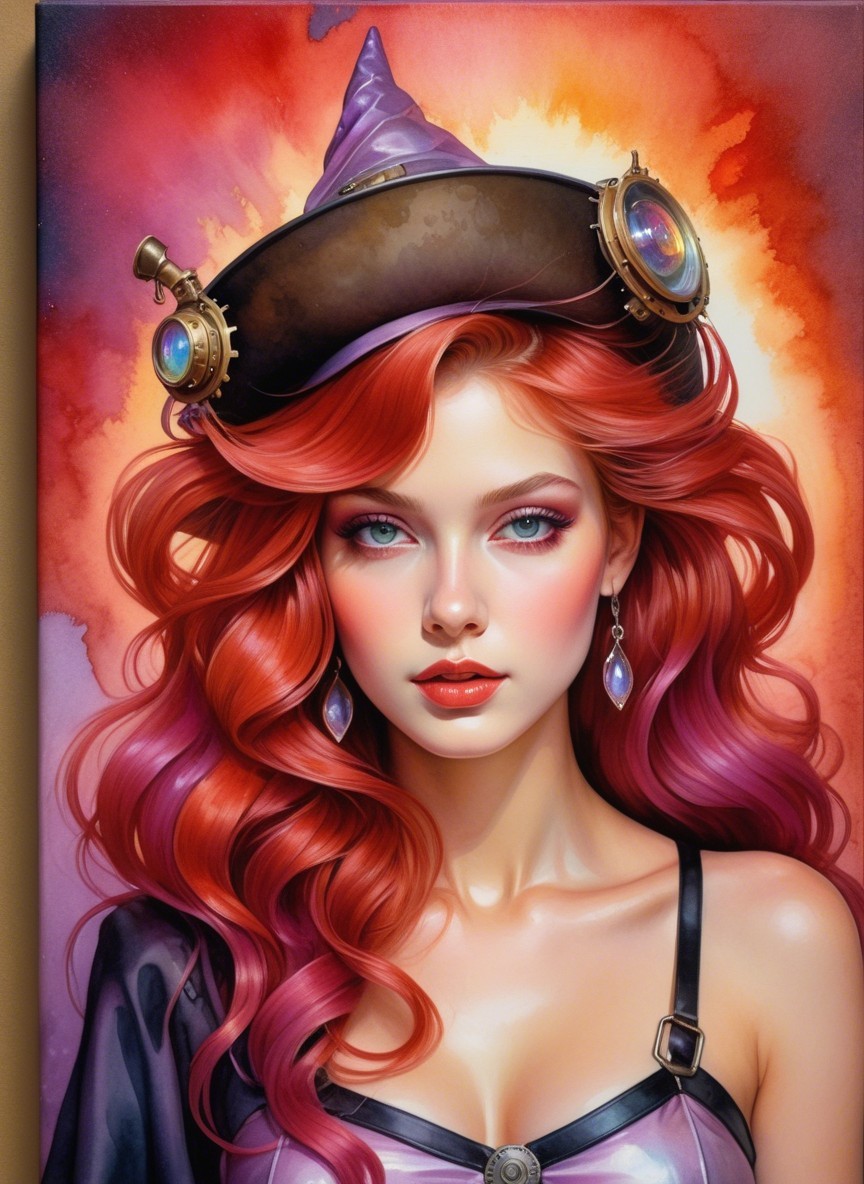 Figurative Art, Color glitch, melted, headshot, tiny strokes, iridescent Watercolor overspray, fantasy art by Paul kidby, pastel colors of beige red lilac, young witch with magical hat, wide-brimmed hat, striking steampunk details, bioluminescent eyes, liquid-pearlescent-plasma and prismatic tilting, 3d effects, contouring outlines by Susan Seddon Boulet, multi-layered, multi perspective, chromatic induction, hues by ho baron, sculpted, chromatic induction, flowing hair illusion 1.7, retrofuturistic, (stylized geometrical patterns, (Color palette is warm jewel toned colors: black, silver, red, grays, chrome & graphite)9:5), natural elements, stacked-up perspective, charcoal textures 1.3, dynamic lighting 1.7, 3d effects 1.3, shrill, mystical, harmonious color palette, soft blue, pinks, opalescent whites, light reds, soft pink highlights, warm purple, highly colored and designed patchwork in textiles & background, Structured maximalism, otherworldly, gradient color inking, muted tones of beige and gre, 3 point lighting from bottom, chrystalline hairstyle, blotting paint, squiggly line-art reminiscence, dark fantasy art merged with pulp art, abstract, physically based, retrofuturistic style by Marsden Hartley and stan lee, stacked-up perspective, stylized pop art illustration merged with storybook illustration, high coloring, precise Gelsculpt 64K, parallax occlusion 1.2, shadow mapping 1.7, layered, 3 point lighting, diffused light, soft rounded edges, dappled dynamic lighting 1.2, tesselated, stippled, contouring outlines by Marsden Hartley, hues by Susan brack, RAW photo, octane render illustration, juvenile, perfect handsface, peeling paint, cel-shaded, 135 mm photography, rule of thirds, line-art patchwork, sculpted, baroque, divisionism, quilling, quaint, joyful atmosphere, overall composition by M. von Brauchitsch, debeh effects, bokeh, beautiful, ultra detailed, reminiscent of style by Catrin Welz-Stein and Endre Penovac and Kaia Coopman