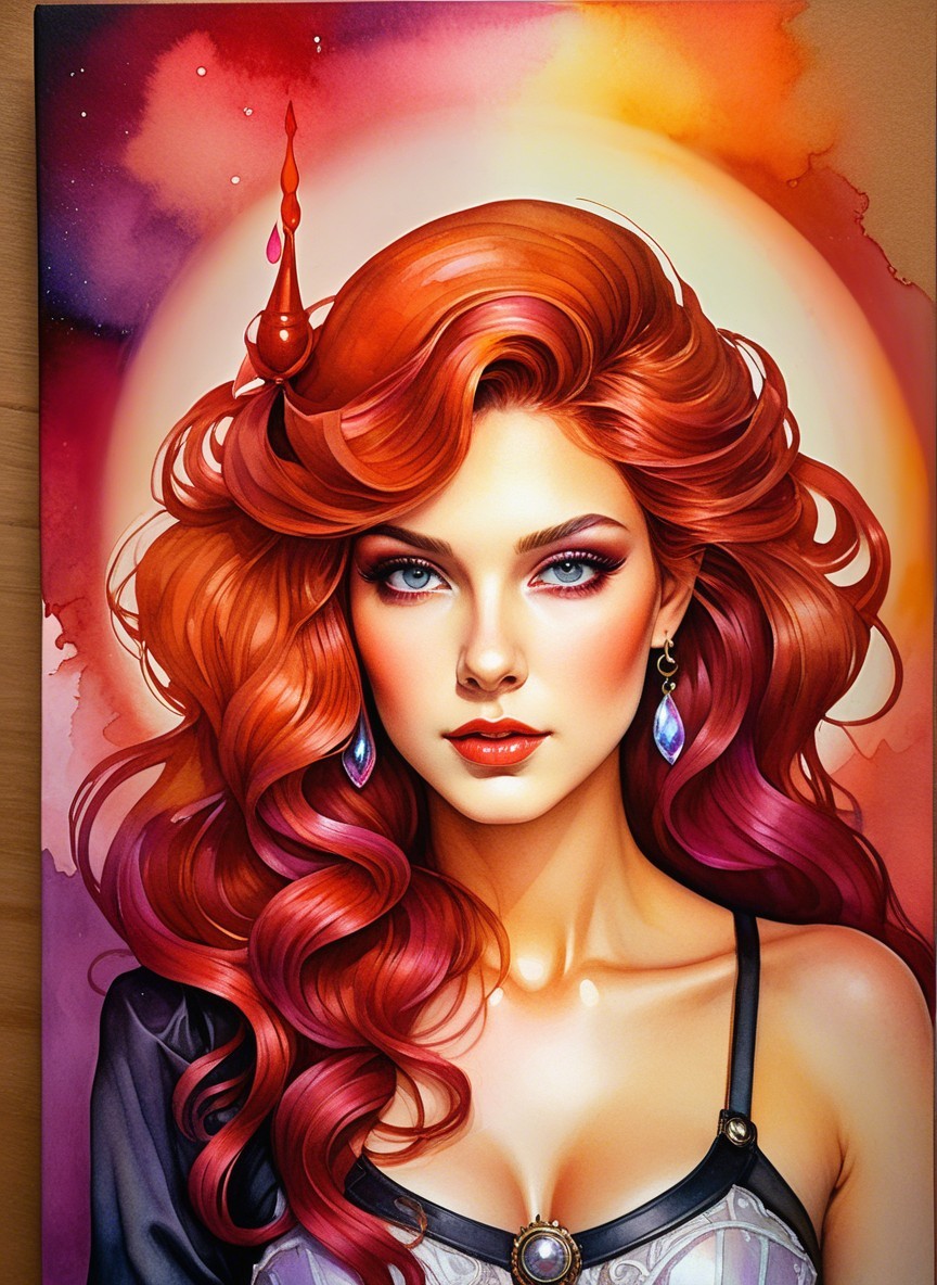 + Prompt:Color glitch, melted, headshot tiny strokes, iridescent Watercolor overspray, fantasy art by Paul kidby, pastel colors of beige red lilac, young witch witch tricone hat, steampunk details, bioluminescent eyes, liquid-pearlescent-plasma and prismatic tilting, 3d effects, contouring outlines by Susan Seddon Boulet, multi-layered, multi perspective, chromatic induction, hues by ho baron, sculpted, chromatic induction, flowing hair illusion 1.7, retrofuturistic, (stylized geometrical patterns, (Color palette is warm jewel toned colors: black, silver, red, grays, chrome & graphite)9:5), natural elements, stacked-up perspective, charcoal textures 1.3, dynamic lighting 1.7, 3d effects 1.3, shrill, mystical, harmonious color palette, soft blue, pinks, opalescent whites, light reds, soft pink highlights, warm purple, highly colored and designed patchwork in textiles & background, Structured maximalism, otherworldly, gradient color inking, muted tones of beige and gre, 3 point lighting from bottom, chrystalline hairstyle, blotting paint, squiggly line-art reminiscence, dark fantasy art merged with pulp art, abstract, physically based, retrofuturistic style by Marsden Hartley and stan lee, stacked-up perspective, stylized pop art illustration merged with storybook illustration, high coloring, precise Gelsculpt 64K, parallax occlusion 1.2, shadow mapping 1.7, layered, 3 point lighting, diffused light, soft rounded edges, dappled dynamic lighting 1.2, tesselated, stippled, contouring outlines by Marsden Hartley, hues by Susan brack, RAW photo, octane render illustration, juvenile, perfect handsface, peeling paint, cel-shaded, 135 mm photography, rule of thirds, line-art patchwork, sculpted, baroque, divisionism, quilling, quaint, joyful atmosphere, overall composition by M. von Brauchitsch, debeh effects, bokeh,