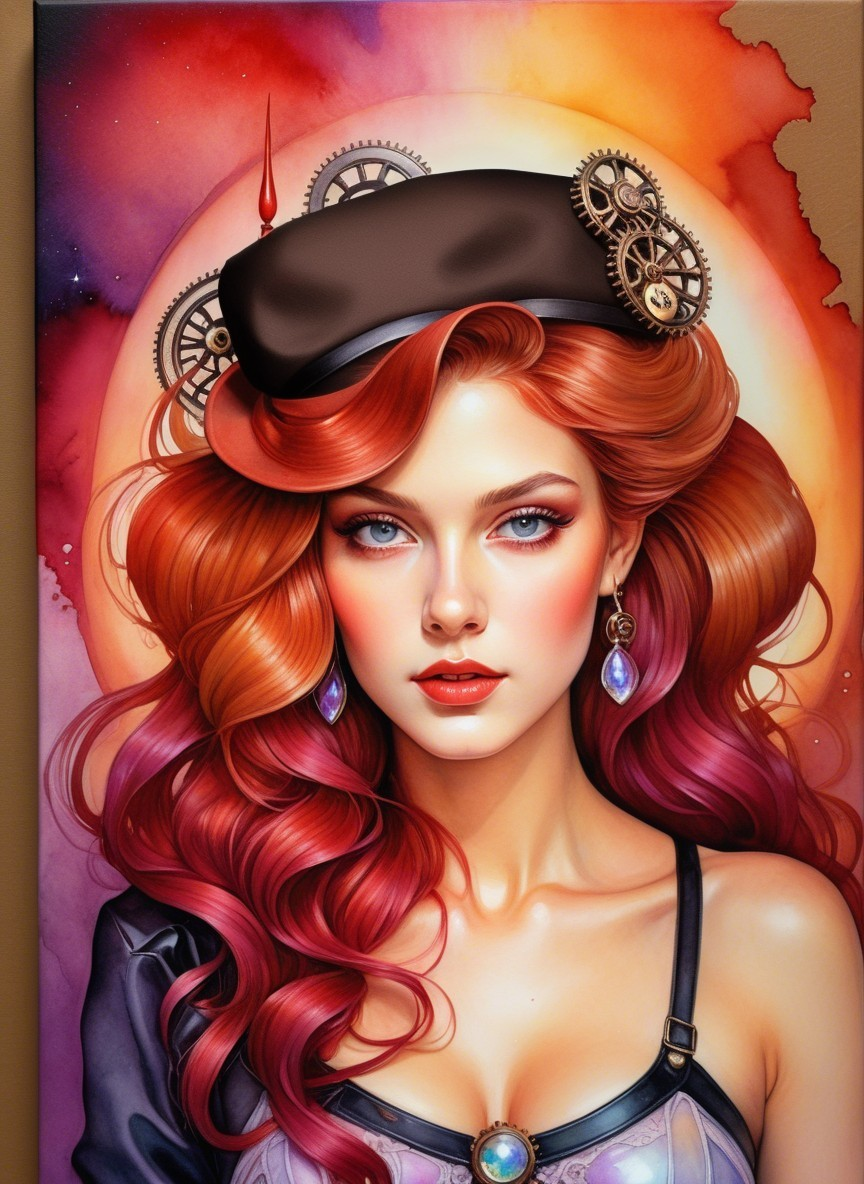 Prompt: Figurative Art, Color glitch, melted, headshot, tiny strokes, iridescent Watercolor overspray, fantasy art by Paul kidby, pastel colors of beige red lilac, young witch with magical hat, wide-brimmed hat, striking steampunk details, bioluminescent eyes, liquid-pearlescent-plasma and prismatic tilting, 3d effects, contouring outlines by Susan Seddon Boulet, multi-layered, multi perspective, chromatic induction, hues by ho baron, sculpted, chromatic induction, flowing hair illusion 1.7, retrofuturistic, (stylized geometrical patterns, (Color palette is warm jewel toned colors: black, silver, red, grays, chrome & graphite)9:5), natural elements, stacked-up perspective, charcoal textures 1.3, dynamic lighting 1.7, 3d effects 1.3, shrill, mystical, harmonious color palette, soft blue, pinks, opalescent whites, light reds, soft pink highlights, warm purple, highly colored and designed patchwork in textiles & background, Structured maximalism, otherworldly, gradient color inking, muted tones of beige and gre, 3 point lighting from bottom, chrystalline hairstyle, blotting paint, squiggly line-art reminiscence, dark fantasy art merged with pulp art, abstract, physically based, retrofuturistic style by Marsden Hartley and stan lee, stacked-up perspective, stylized pop art illustration merged with storybook illustration, high coloring, precise Gelsculpt 64K, parallax occlusion 1.2, shadow mapping 1.7, layered, 3 point lighting, diffused light, soft rounded edges, dappled dynamic lighting 1.2, tesselated, stippled, contouring outlines by Marsden Hartley, hues by Susan brack, RAW photo, octane render illustration, juvenile, perfect handsface, peeling paint, cel-shaded, 135 mm photography, rule of thirds, line-art patchwork, sculpted, baroque, divisionism, quilling, quaint, joyful atmosphere, overall composition by M. von Brauchitsch, debeh effects, bokeh, beautiful, ultra detailed, reminiscent of style by Catrin Welz-Stein and Endre Penovac and Kaia Coopman