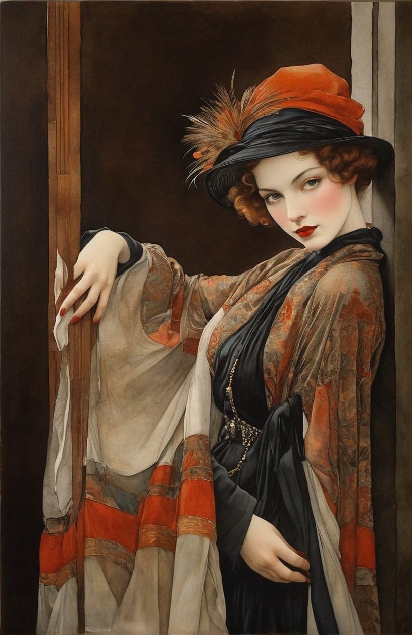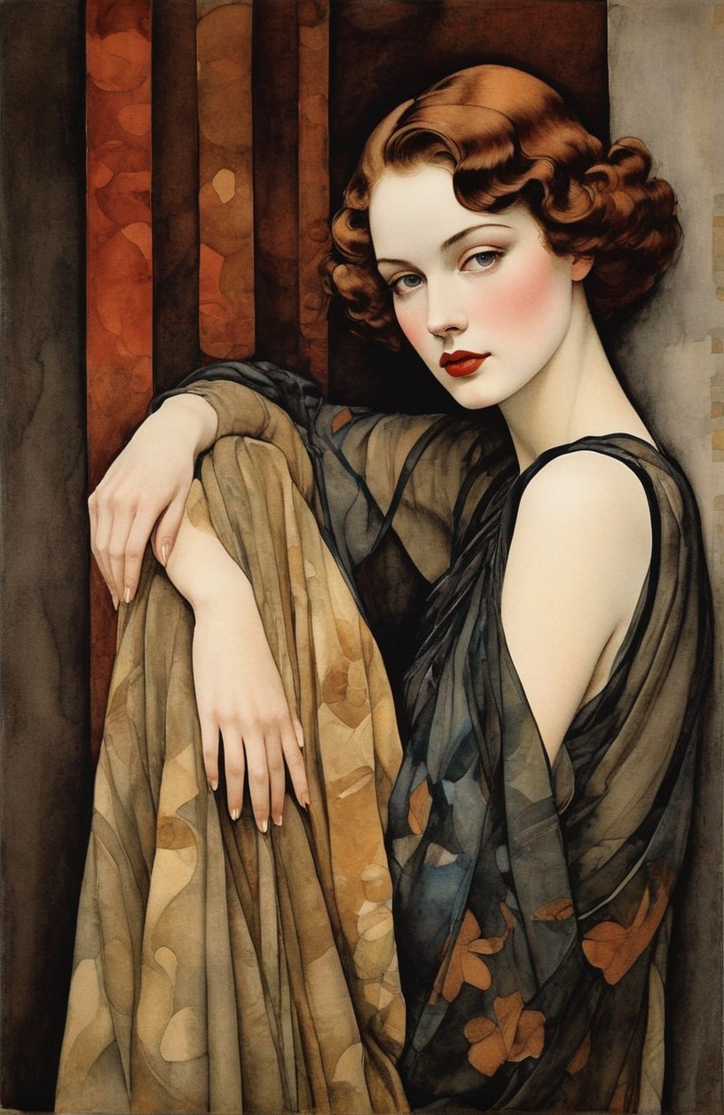 Prompt: Beautiful woman in the style of WALTER MARTIN BAUMHOFER and rené gruau whimsical, beautiful, poignant, touching. soft watercolor extra water in Art Deco by Annigoni, Egon Schiele, Milo Manara, Botticelli, Catrin Welz-Stein, Jean Metzinger, Klimt, perfect eyes, perfect hands face , highly detailed, complementary colors, hyper detailed. Watercolor and ink splatter, dynamic pose,