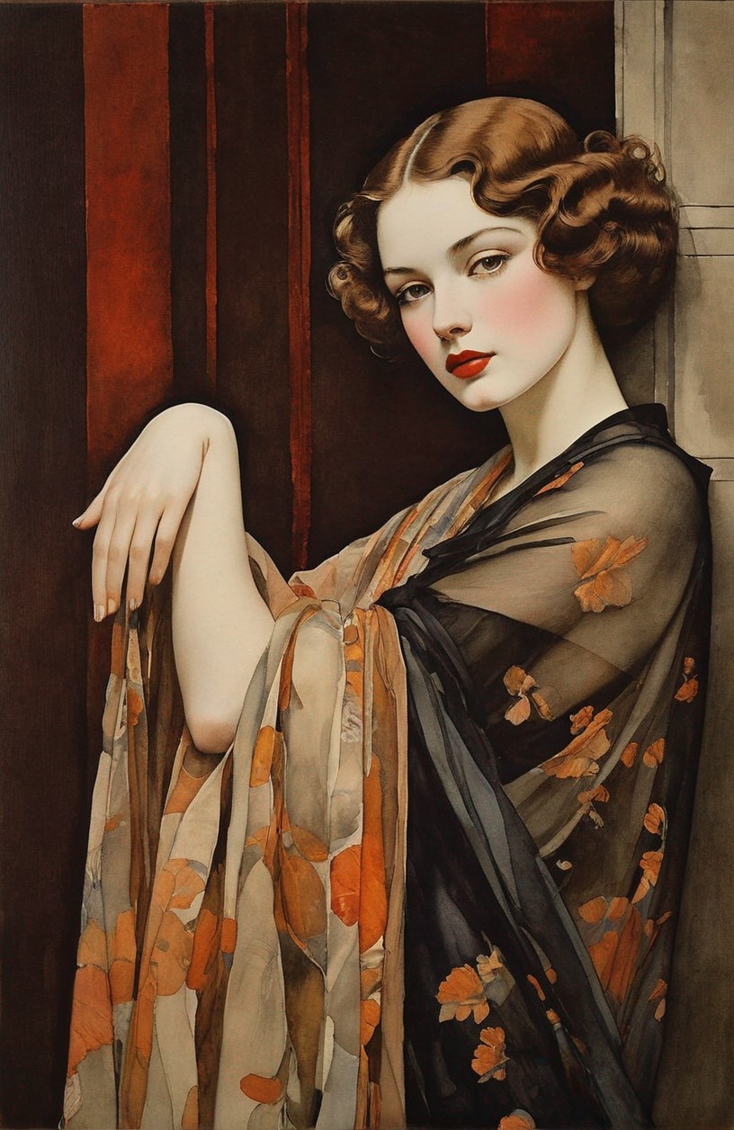 An art deco style illustration featuring a woman with red lips, wavy hair, sitting, with a patterned dress and a backdrop of vertical lines.