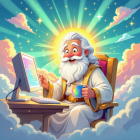 Original prompt: A joyful cartoon depiction of God as an elderly man with a big white beard and twinkling eyes, sitting at a glowing floating computer desk in a bright sky, wearing a shimmering white robe with golden edges, typing cheerfully on a rainbow-lit keyboard while holding a coffee mug, surrounded by fluffy clouds and dancing sunbeams, vibrant psychedelic swirling patterns of electric blue, hot pink, sunny yellow, and lush green in the background, kaleidoscopic neon aura radiating happy vibrations, comic book style with bold outlines and saturated colors, sparkling stars and floating glitter, warm radiant lighting, cheerful whimsical atmosphere, highly detailed and picturesque, infinite celestial wonder, uplifting and magical scene.