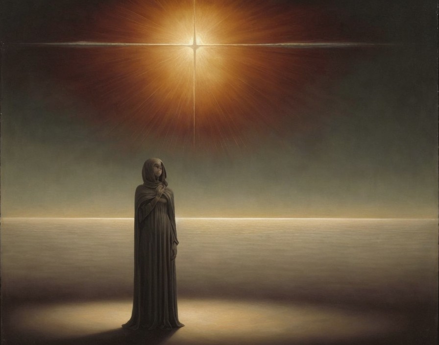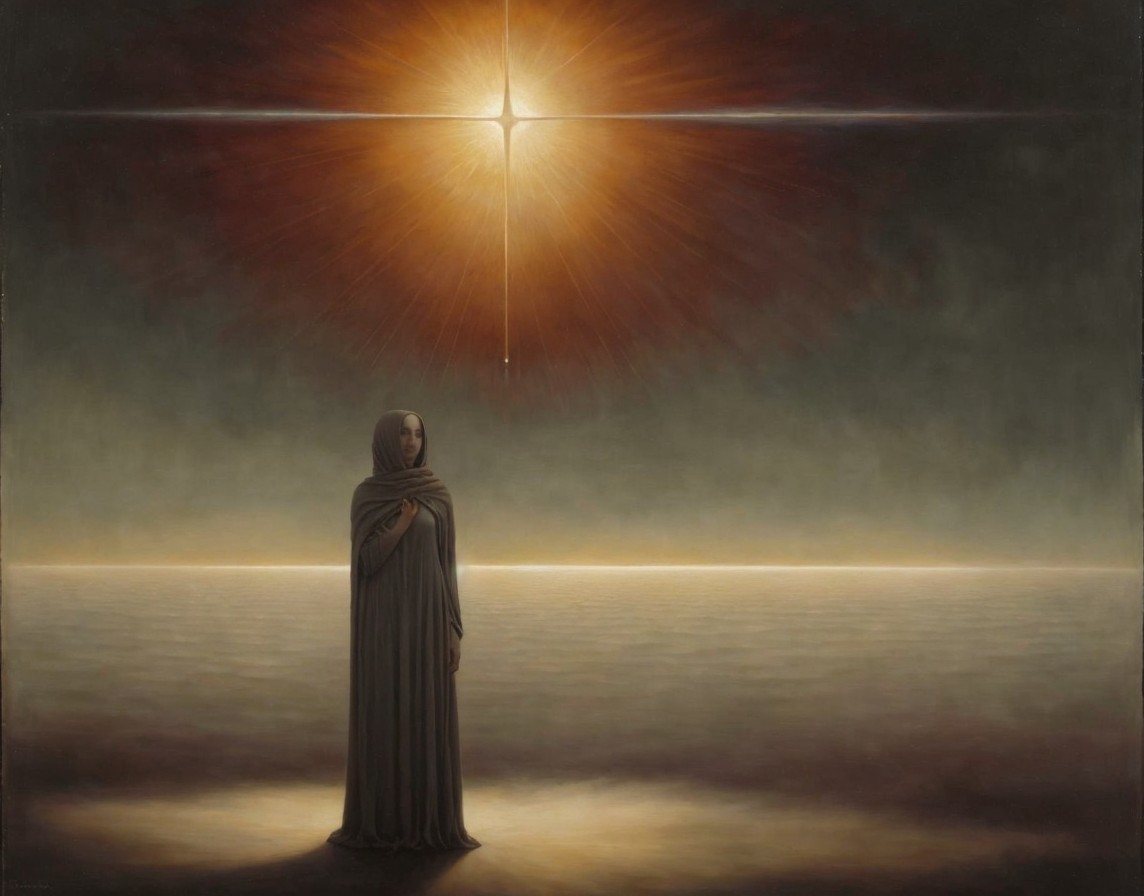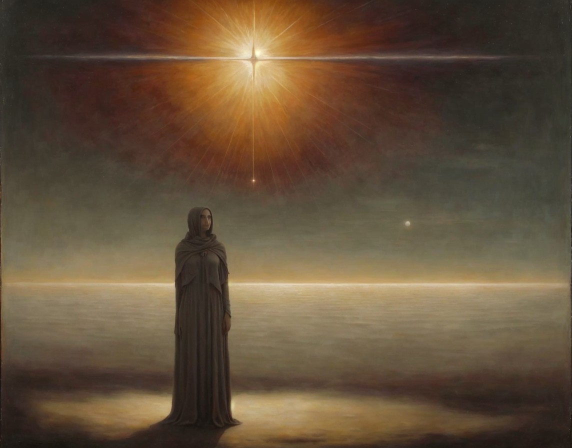 Solitary Figure in Ethereal Landscape with Celestial Bodies