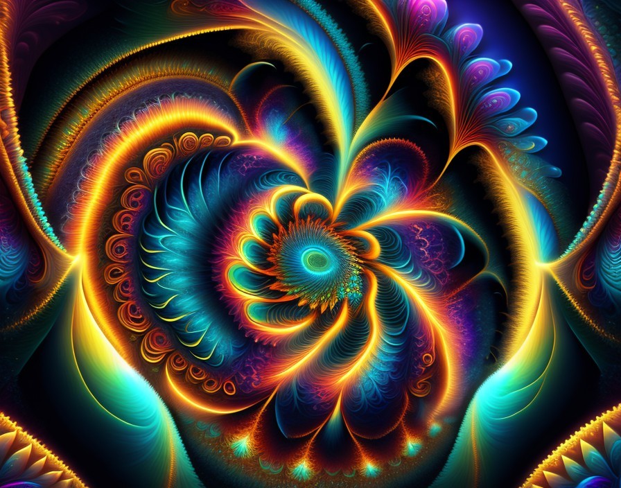 A vibrant digital fractal with swirling patterns and a spectrum of colors creating a hypnotic, kaleidoscopic effect.
