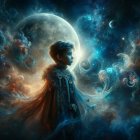 The mysterious boy stands in profile against a mesmerizing backdrop of swirling cosmic clouds and vibrant colors, illuminated by a large, luminous full moon.