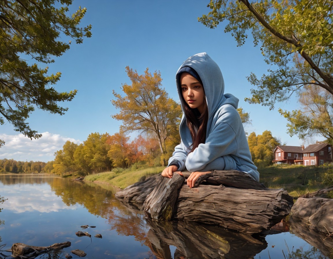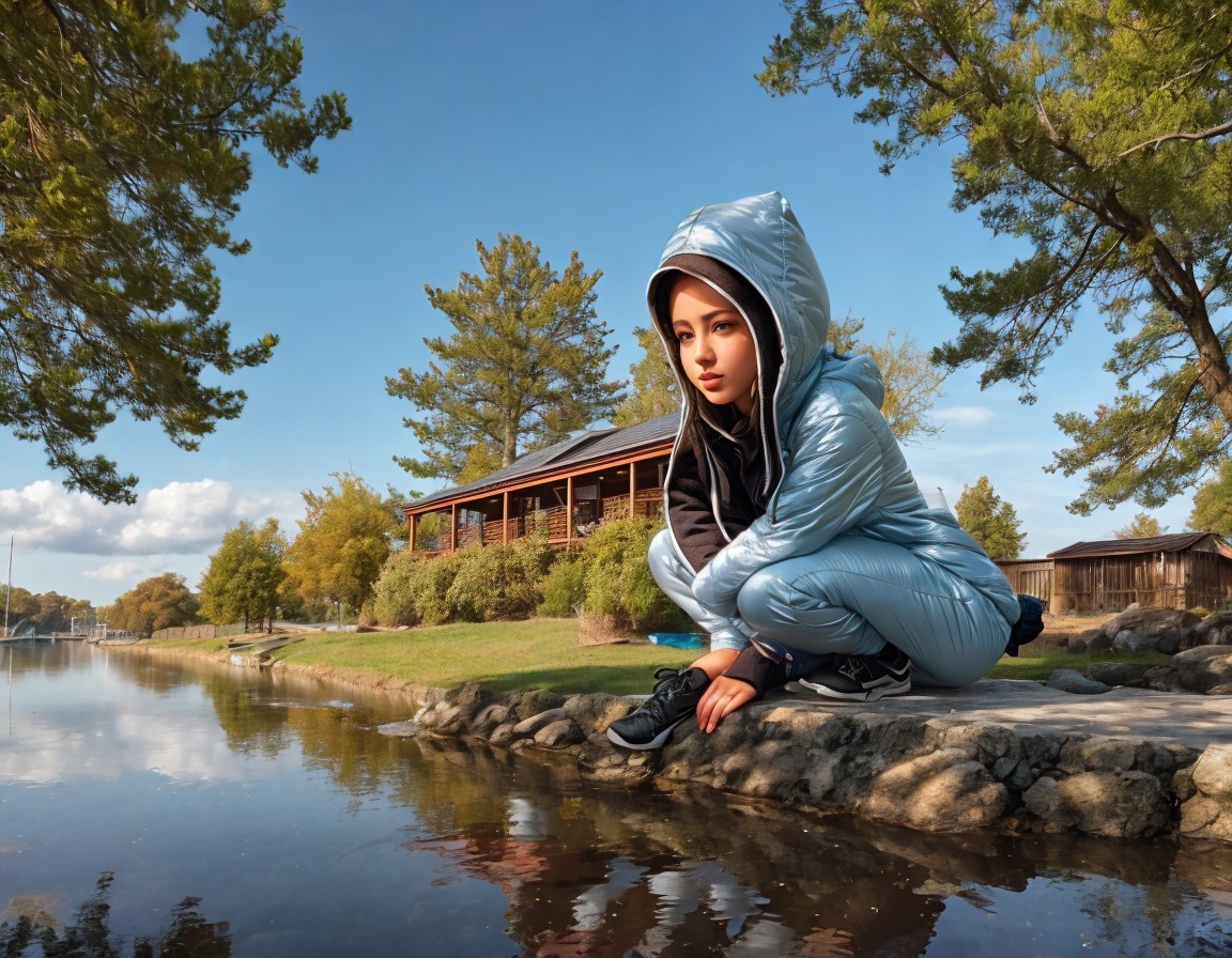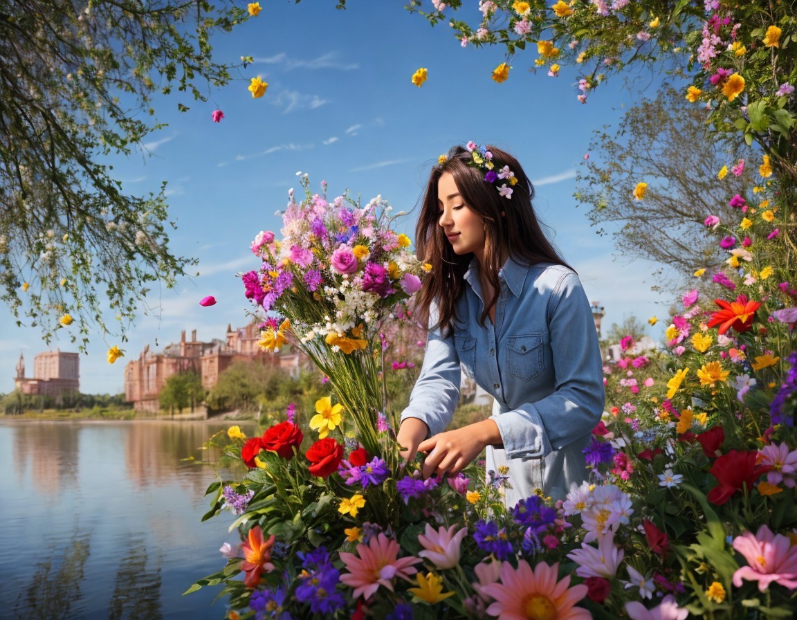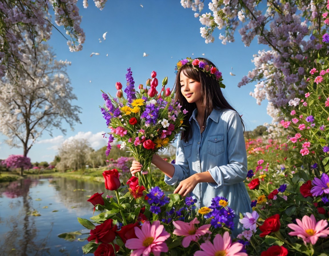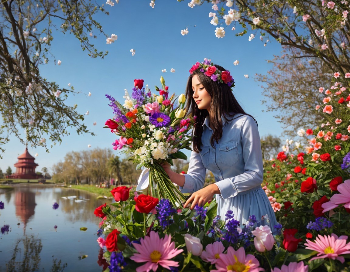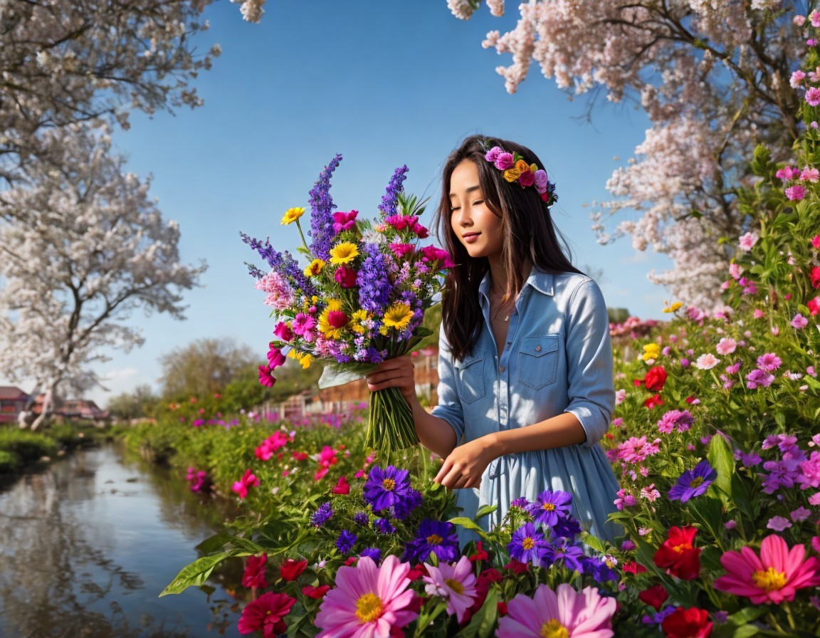 A serene scene featuring a woman in a white dress, holding a vibrant bouquet amidst blooming flowers by a tranquil waterway, surrounded by blooming trees under a clear blue sky.