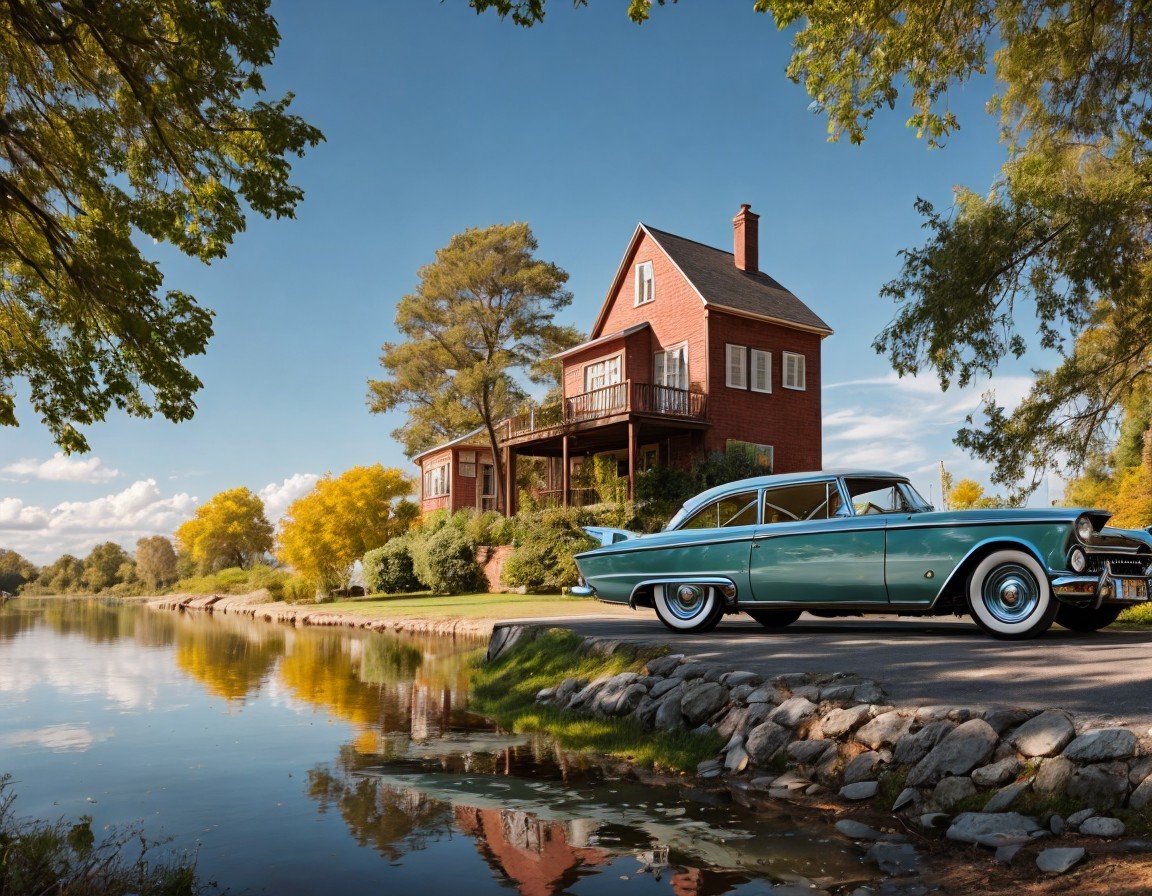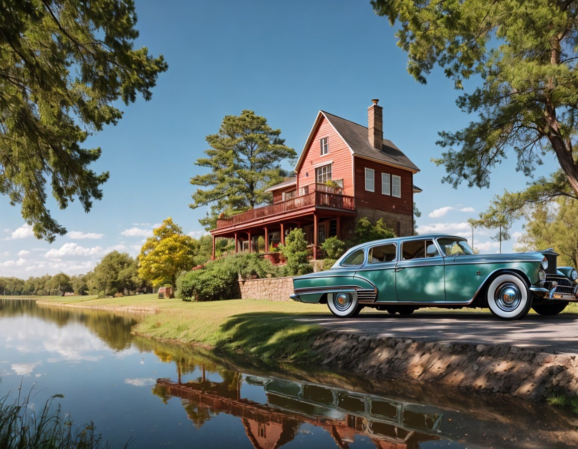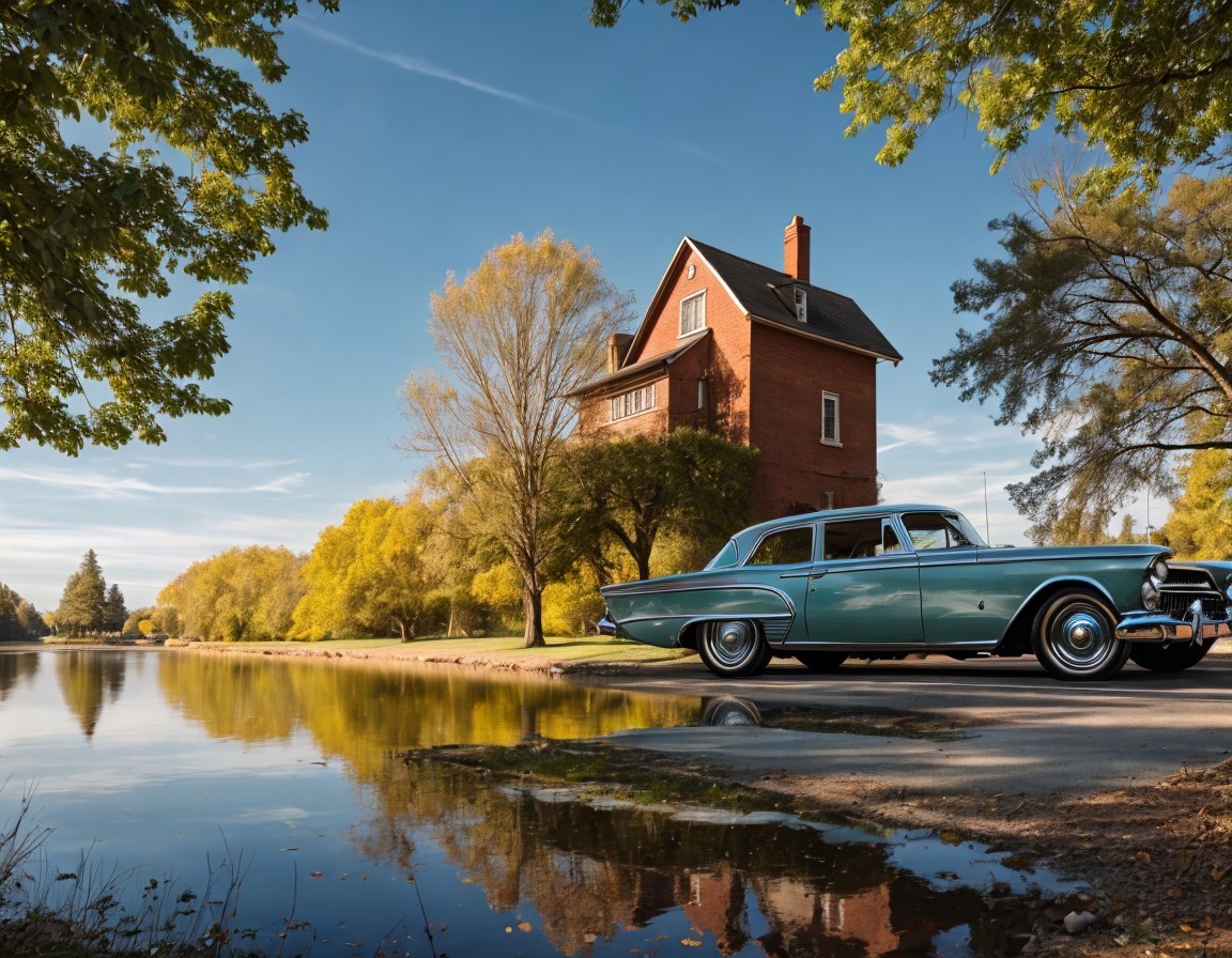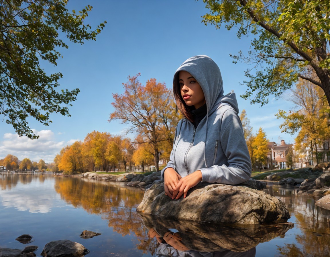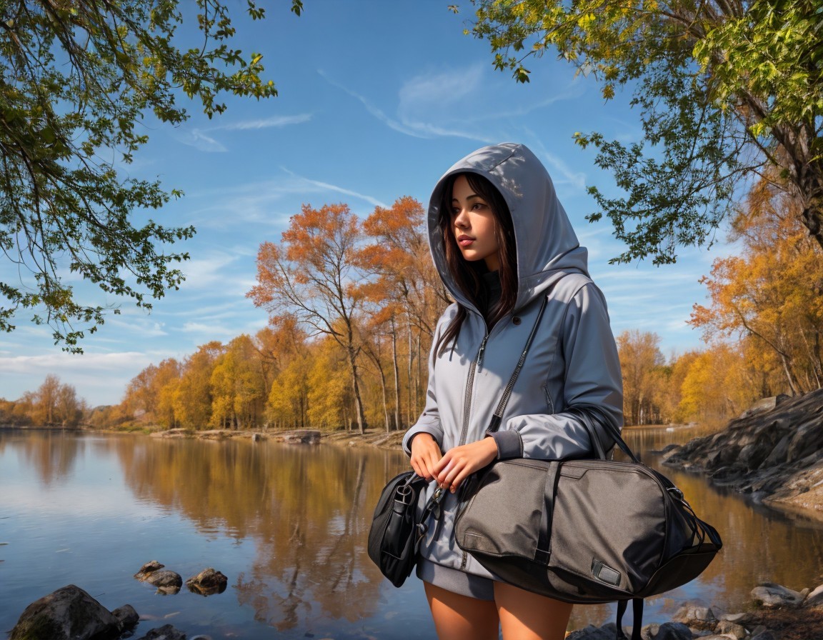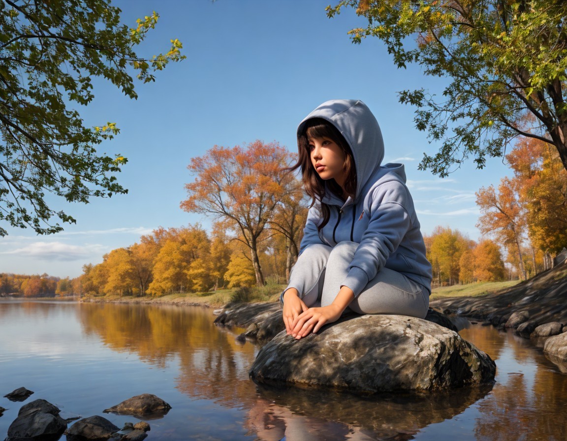A serene scene featuring a woman in a white dress, holding a vibrant bouquet amidst blooming flowers by a tranquil waterway, surrounded by blooming trees under a clear blue sky.