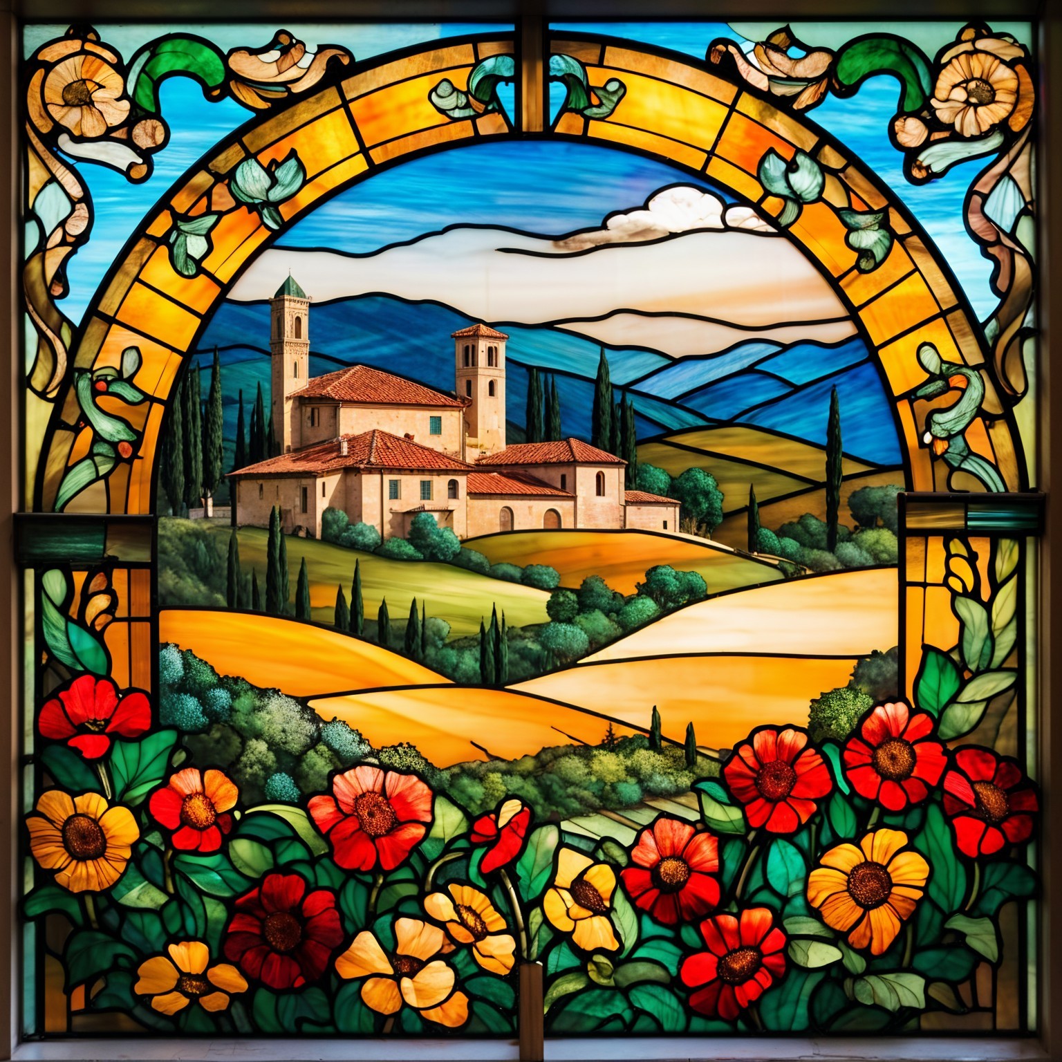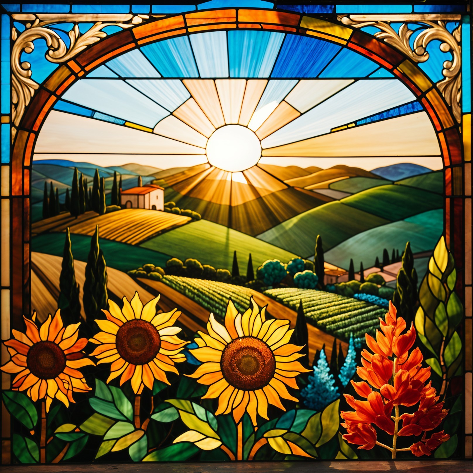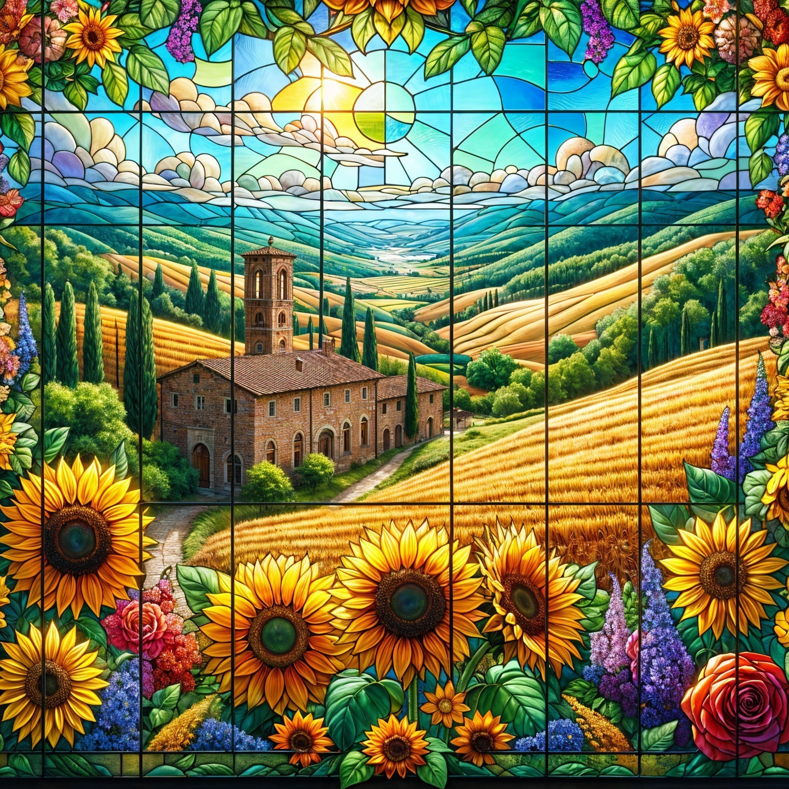 The image features a vibrant stained glass window depicting a field of sunflowers under a bright sky. Sunflowers in the foreground complement the picturesque landscape beyond the glass.