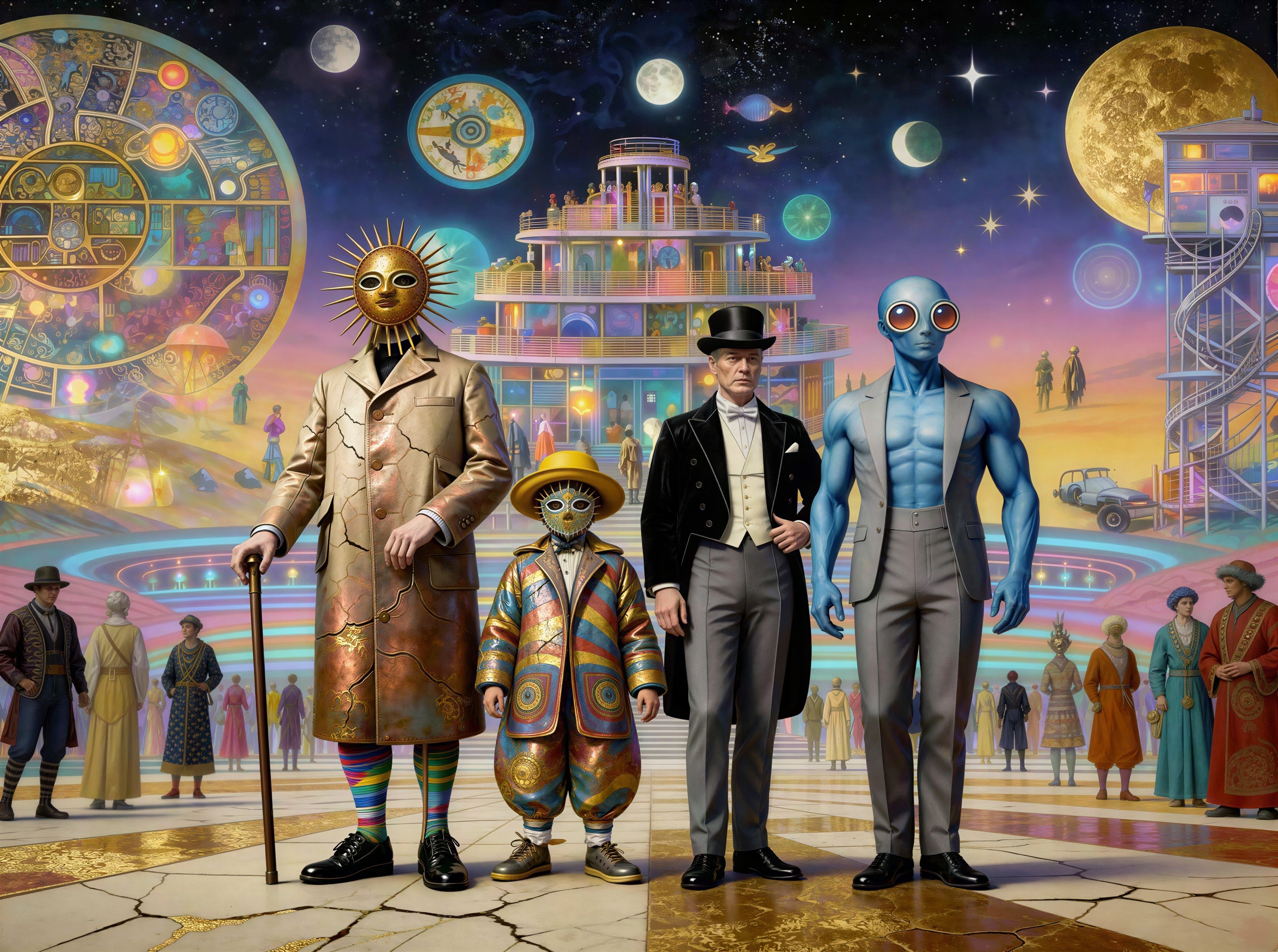 In the background, there’s a vibrant, fantastical landscape with a richly detailed building resembling a futuristic structure, adorned with various clock-like patterns and glowing orbs. The background also features a sky filled with celestial entities, including moons and stars, alongside other figures dressed in eclectic attire, contributing to the surreal atmosphere of the setting