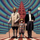 3. The third figure is a middle-aged man dressed in a classic black tailcoat and bowler hat. He has a serious expression and stands confidently, showcasing a light gray suit underneath. His skin is a pale tone, and he gazes straight ahead, exuding authority.