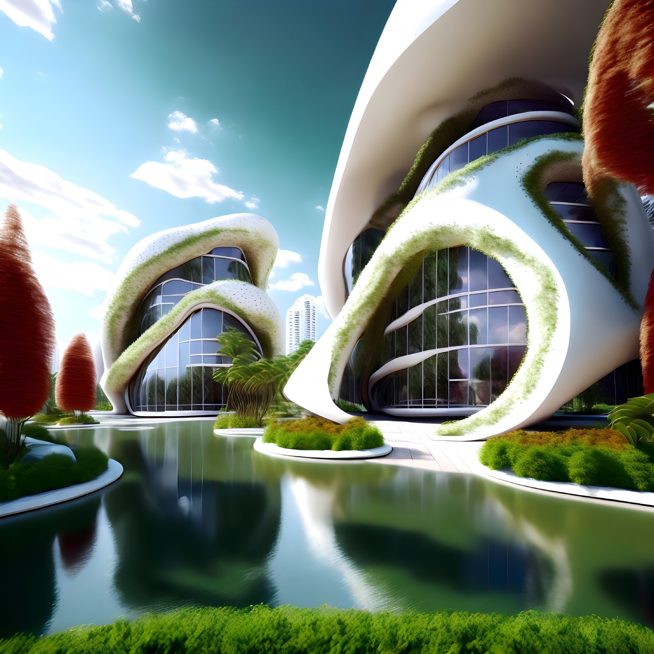 are surrounded by lush greenery and tranquil water. The scene features a harmonious blend of architecture and nature under a clear blue sky.