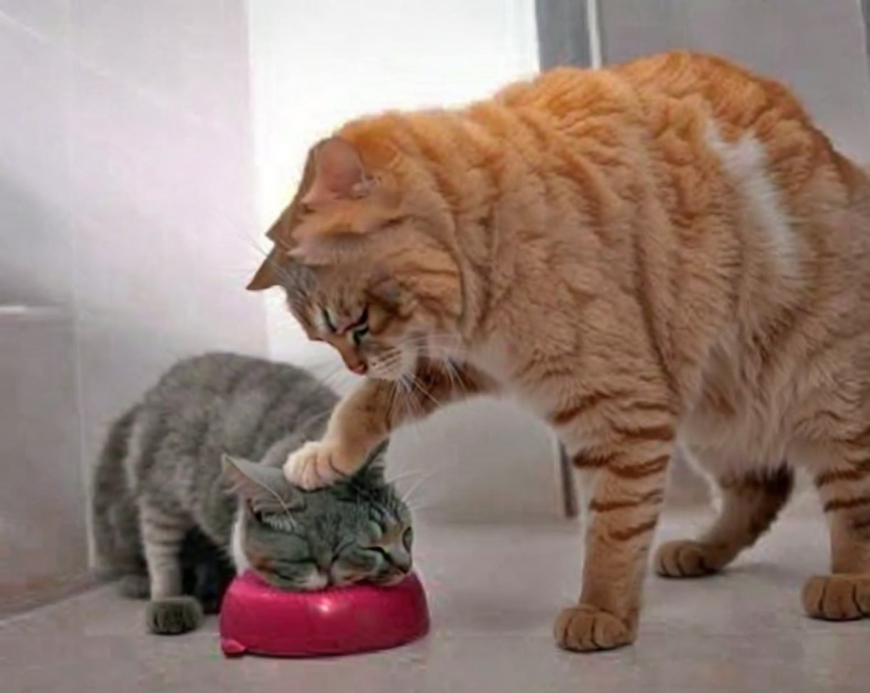 + Prompt:one cat pushes a second cat's face into the food dish, demanding, "You like the food? Say you like the food!". a glass and metal piramide artifact in the background.