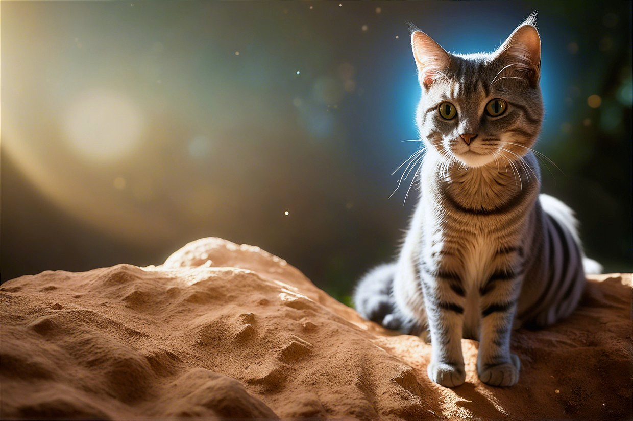 A fluffy striped cat sits atop a rocky surface, illuminated by soft, ethereal light. Its bright eyes gleam with curiosity, set against a dreamy, cosmic backdrop.